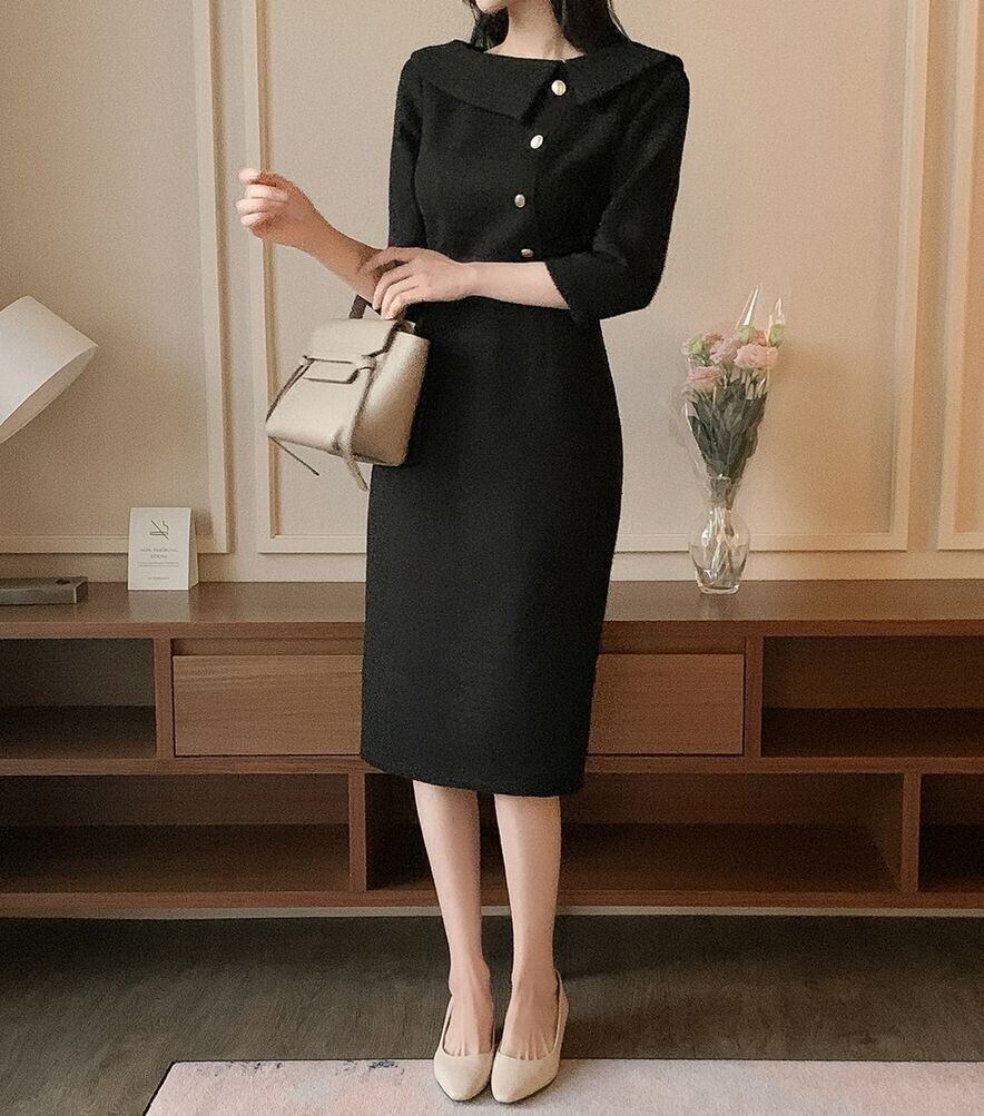 Asymmetric collar elegant three quarter sleeve slim dress ( 2color )