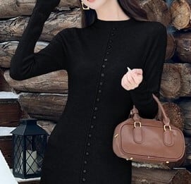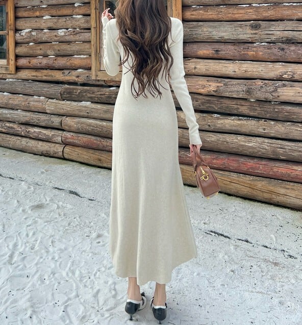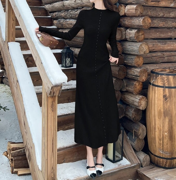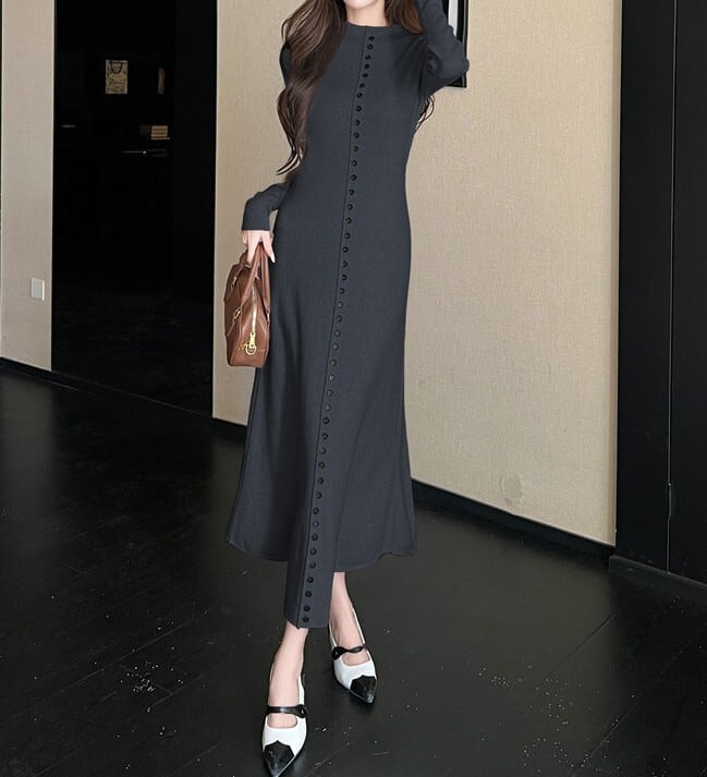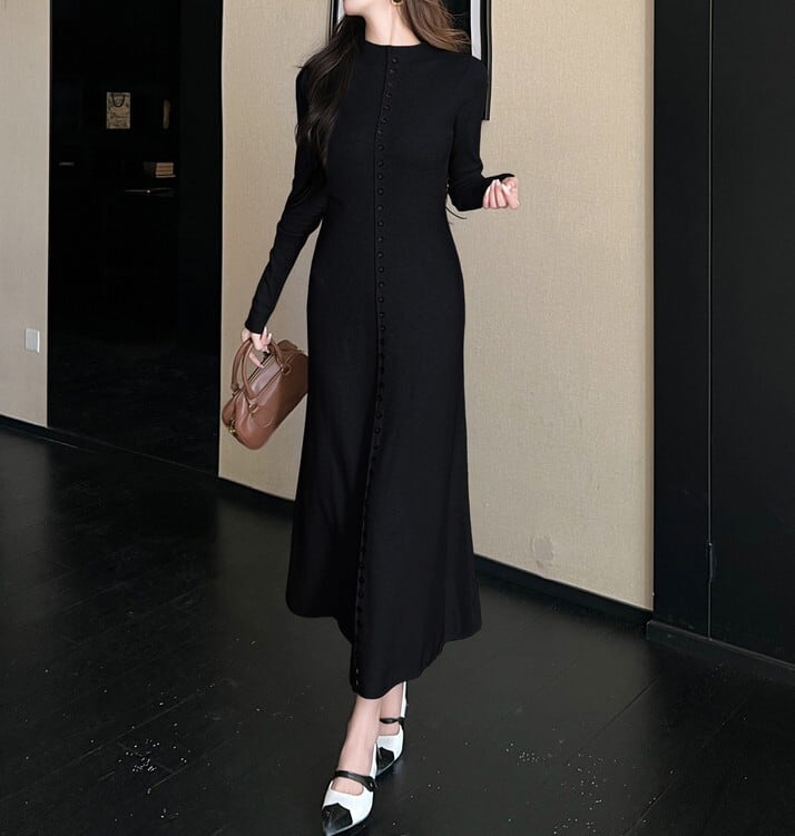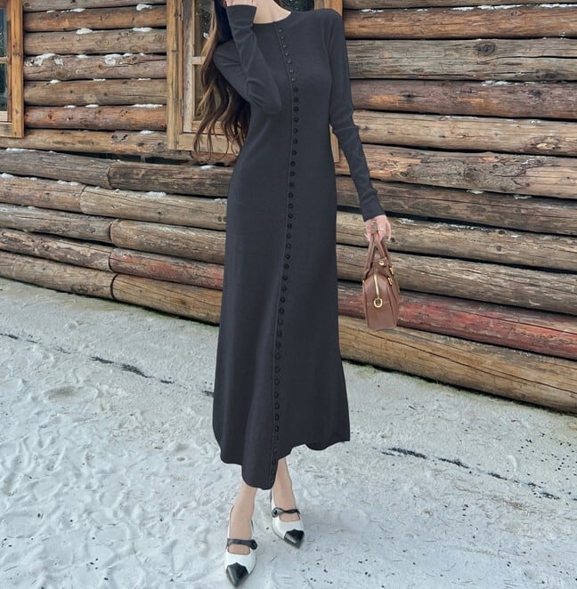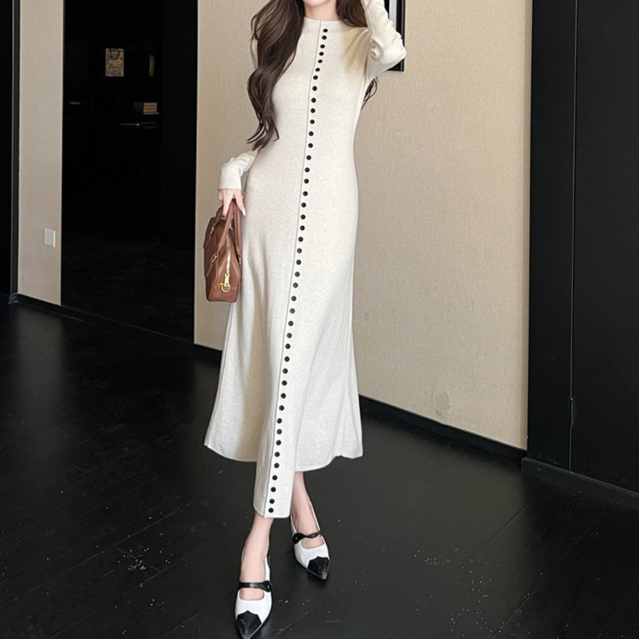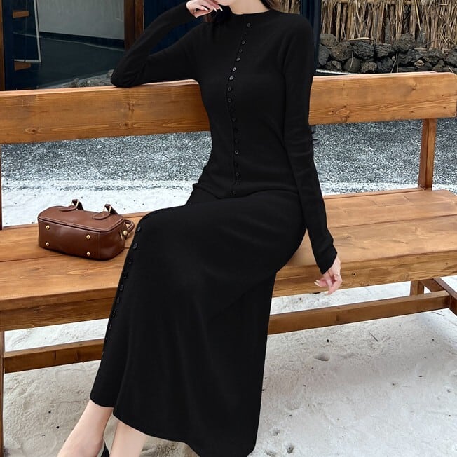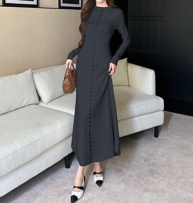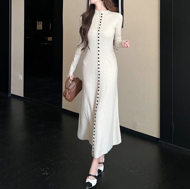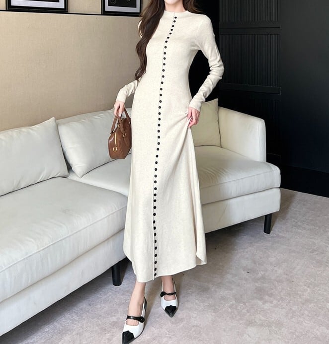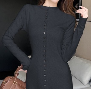 Half high neck elegant single breast swing long knit dress ( 3color )