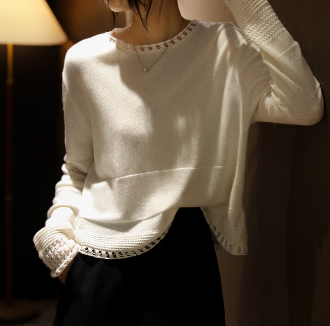 着用するだけで大人可愛い雰囲気が漂うレースステッチエレガントスリムニット。