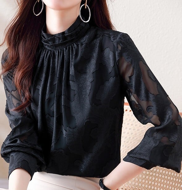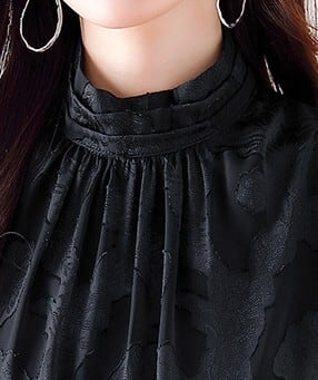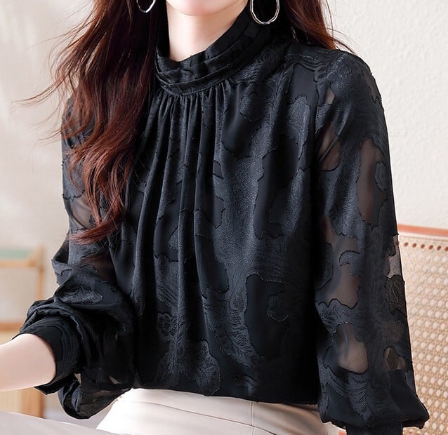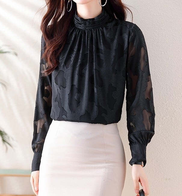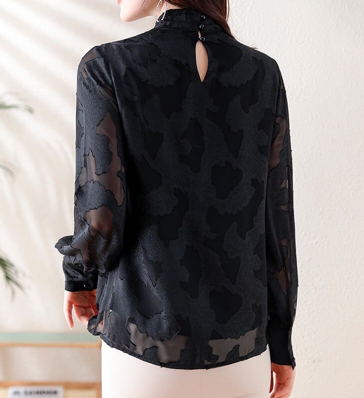 着用するだけでエレガントでフェミニンな雰囲気が漂うスタンドカラーエレガントレトロシフォンシャツ。