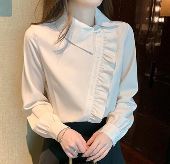 Asymmetric collar elegant chest ruffle chiffon blouse