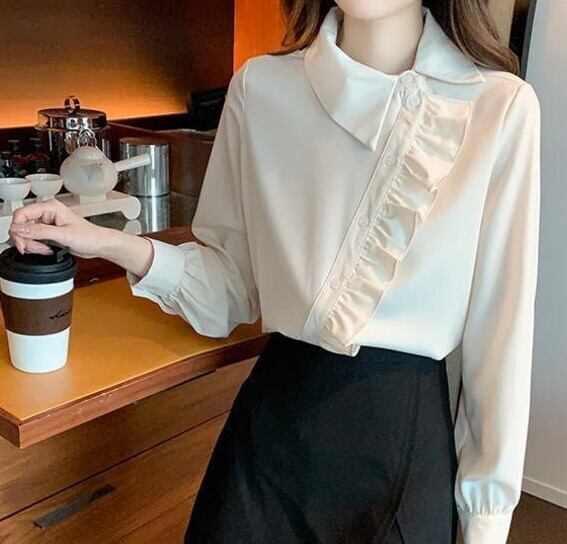 着用するだけで大人可愛い雰囲気が漂うアシンメトリックエレガントチェストラッフルシフォンブラウス 。