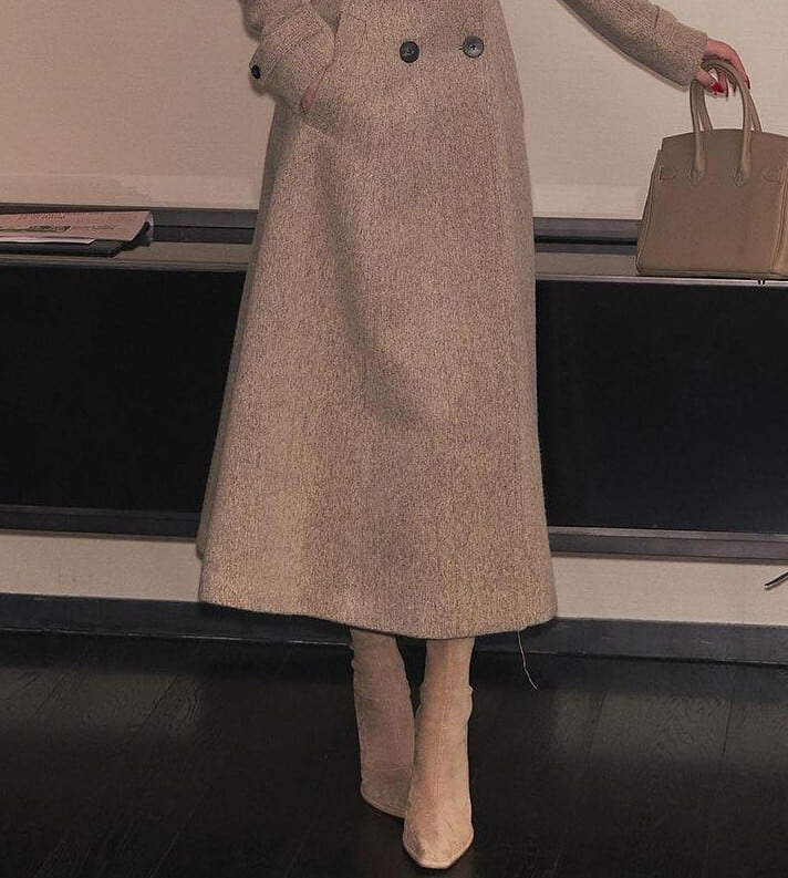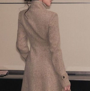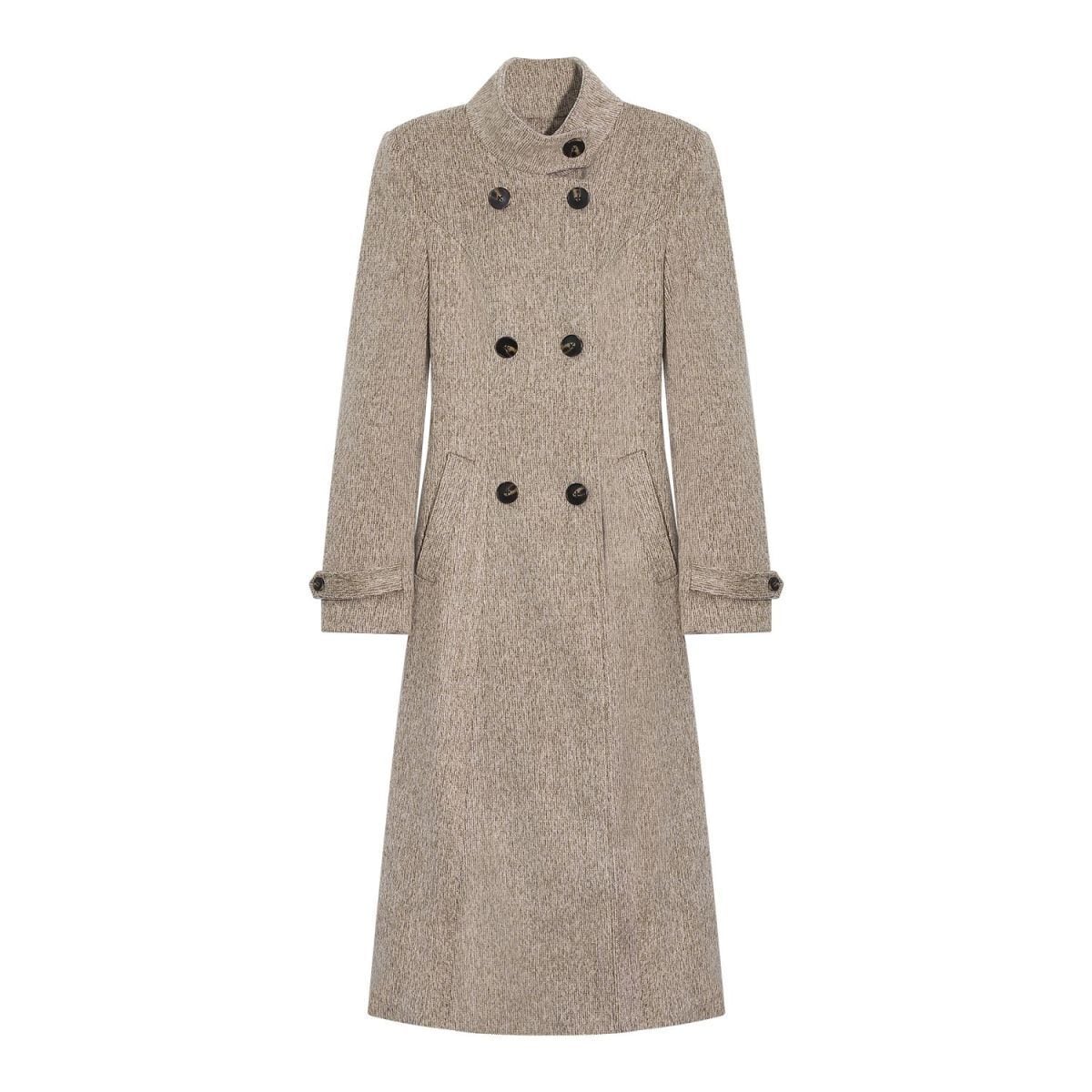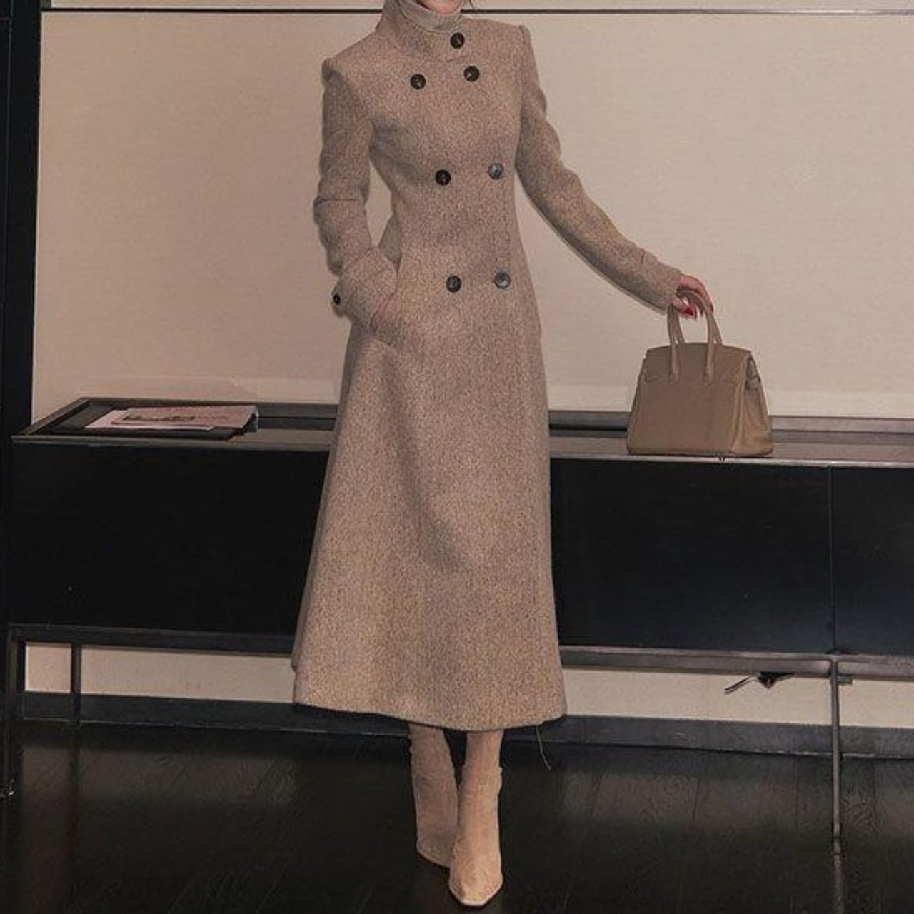 羽織るだけでエレガントな雰囲気が漂うスタンドカラーエレガントダブルブレストロングスリムコート。