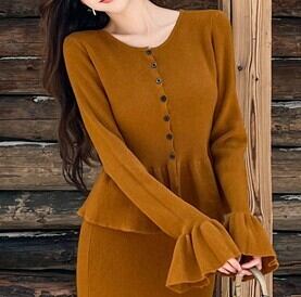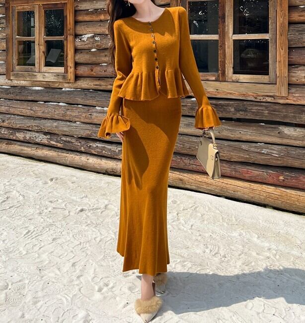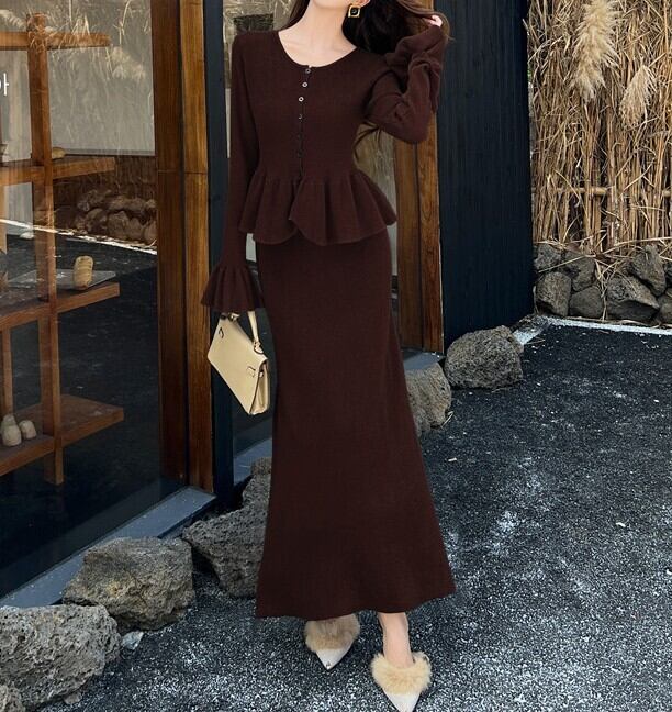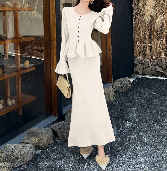 Single breast elegant ruffle stitch long knit dress set up
