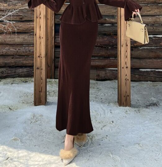 シングルブレストヘムラッフルニットとハイウエストロングニットスカートのセット商品です。