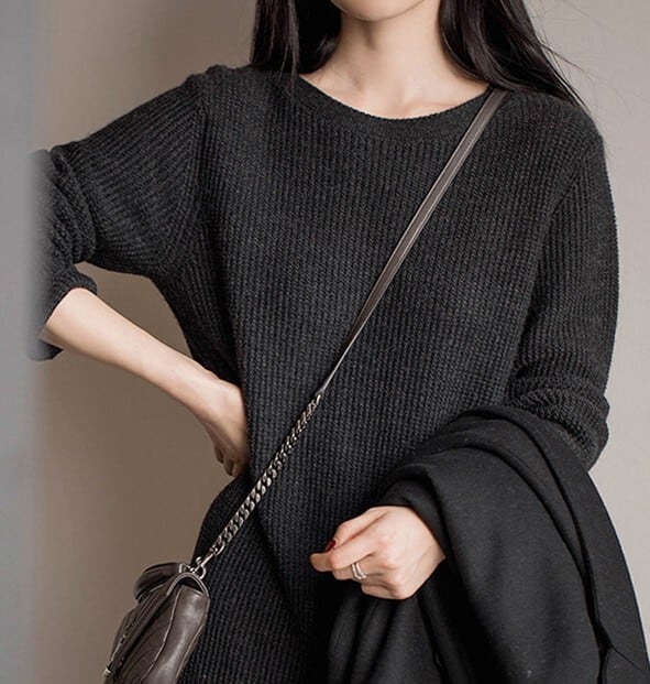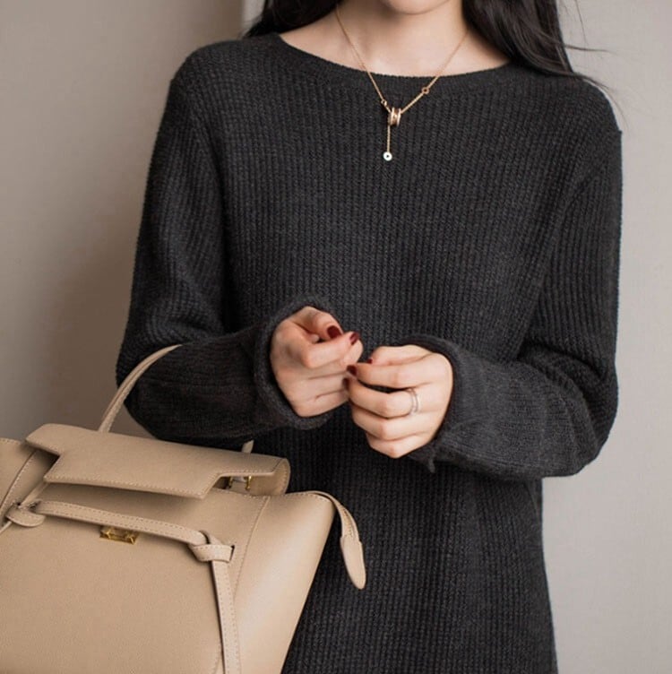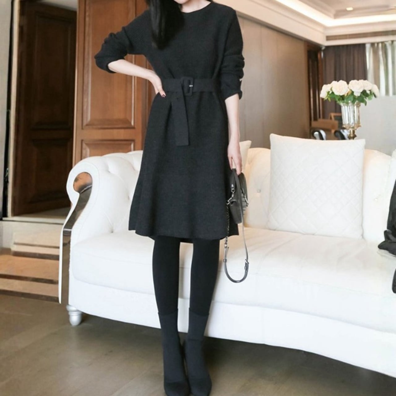 着用するだけでフェミニンな雰囲気が漂うクルーネックエレガントウエストストラップスリムミドルニットドレス。