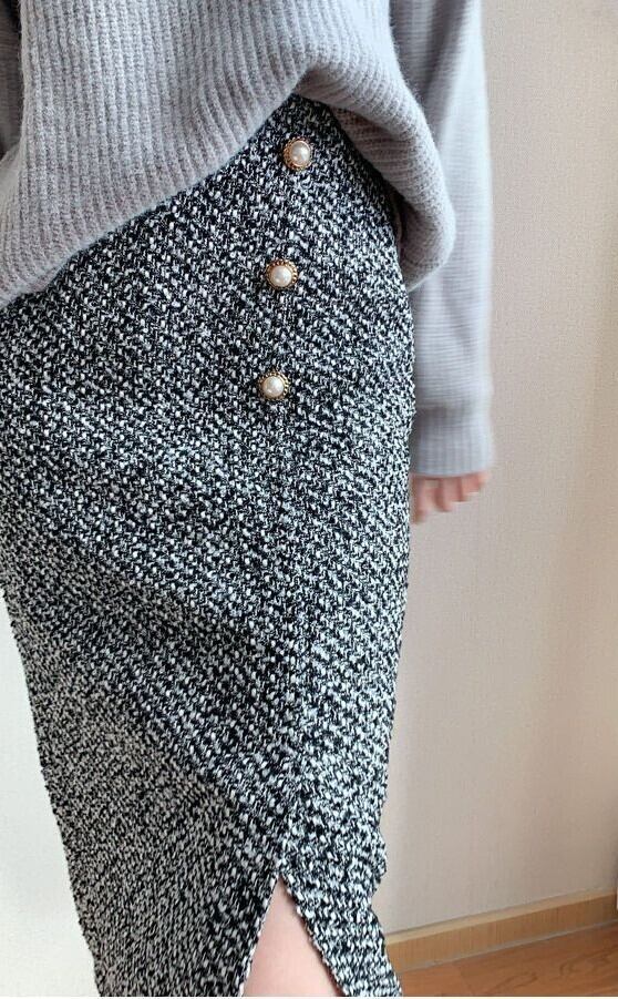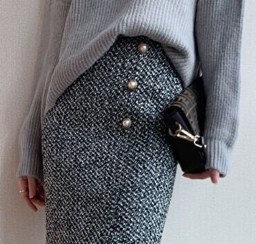 着用するだけでフェミニンな雰囲気が漂うシングルブレストエレガントミドルツイードスカート。