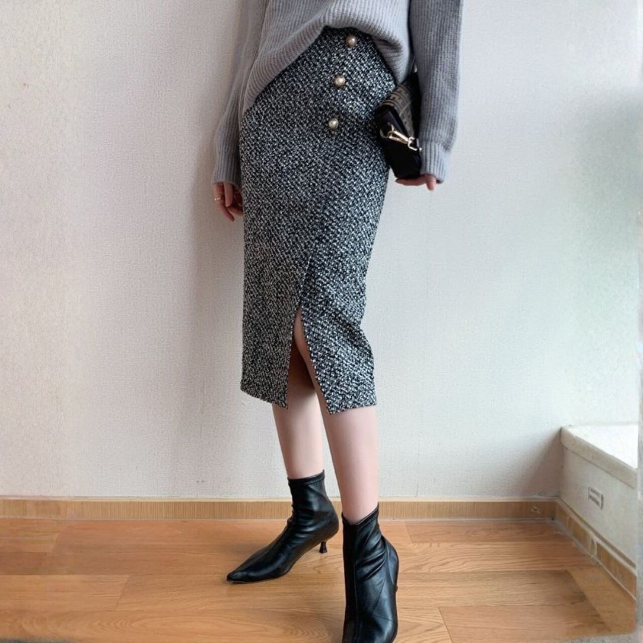 High waist elegant front slit middle tweed skirt