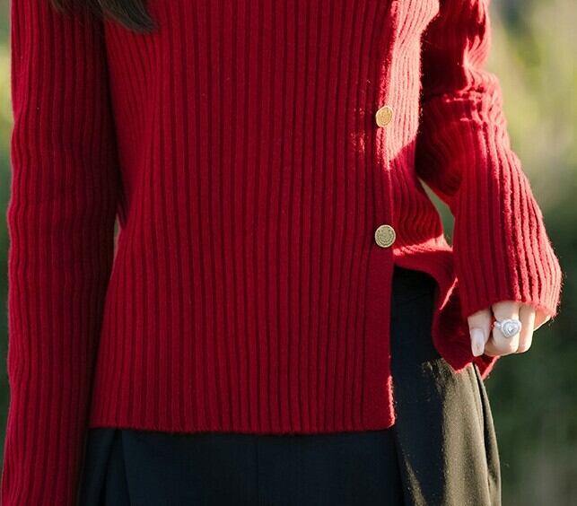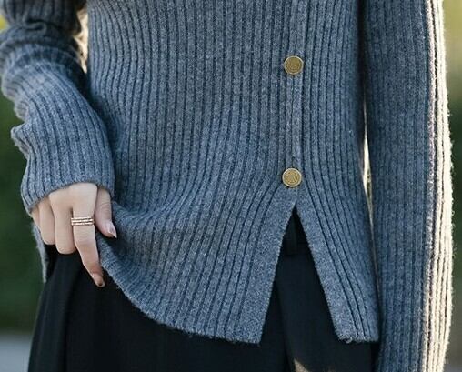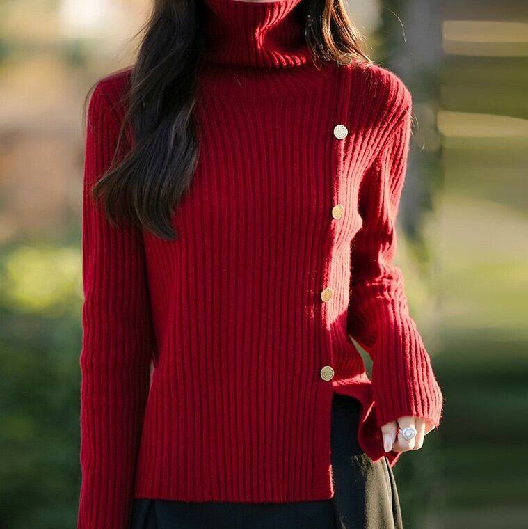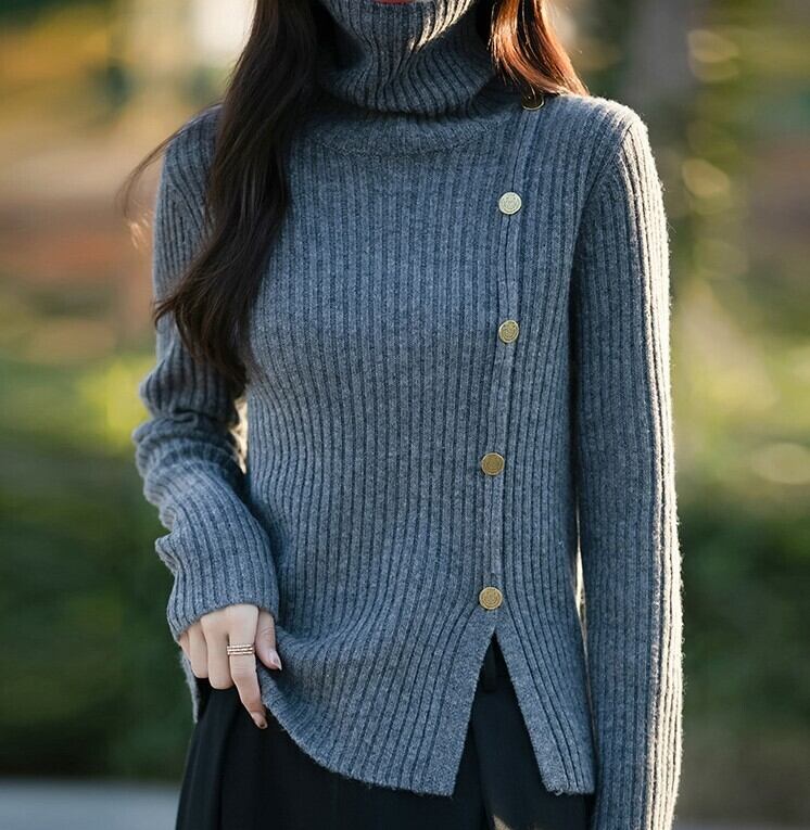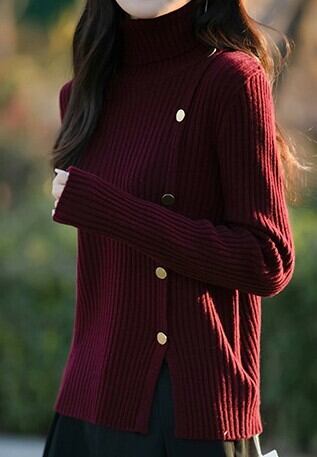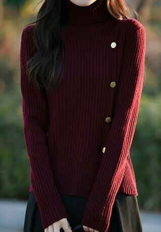 着用するだけで大人可愛い雰囲気が漂うハイネックエレガントブレストデザインヘムスリットニット。