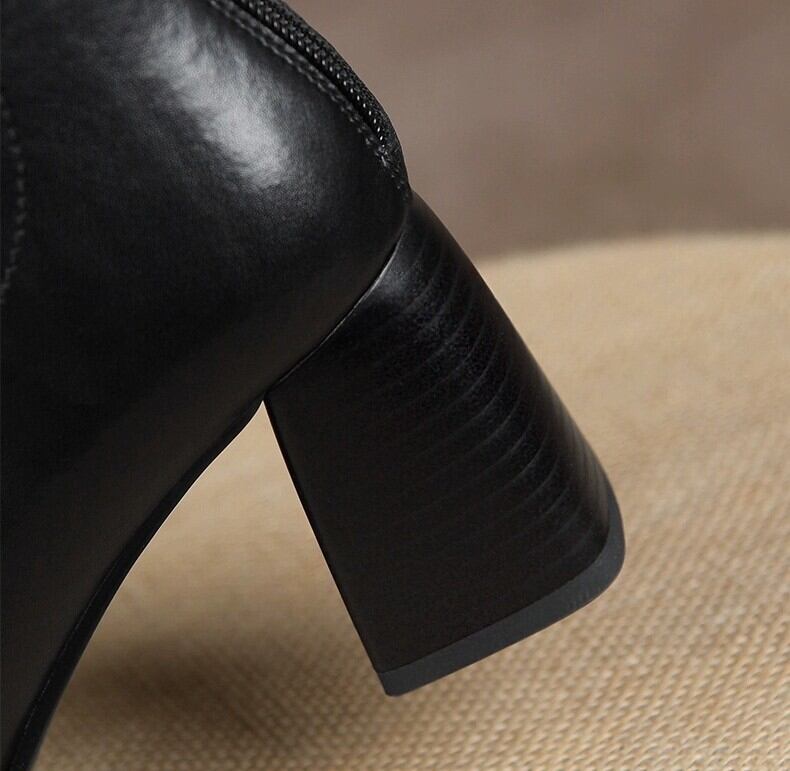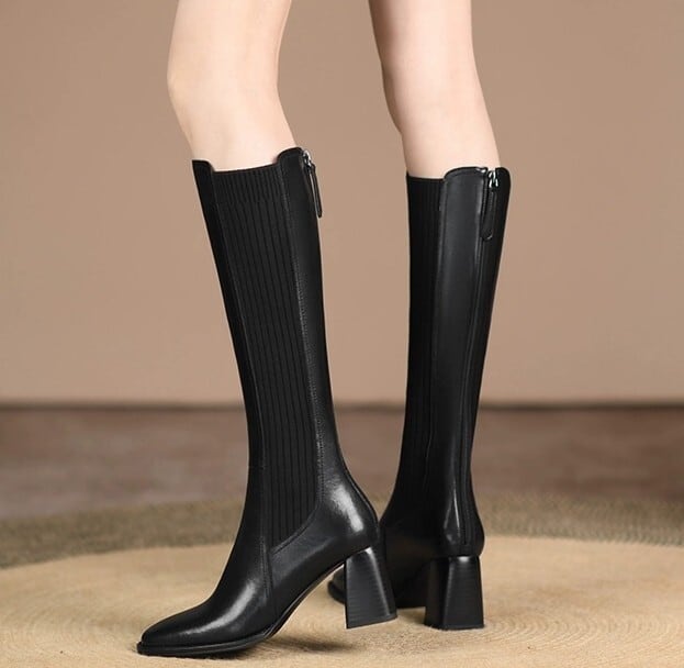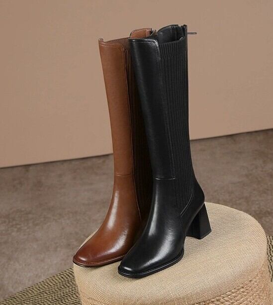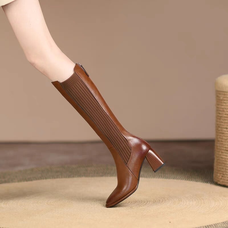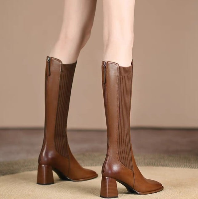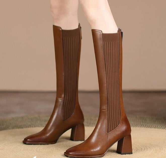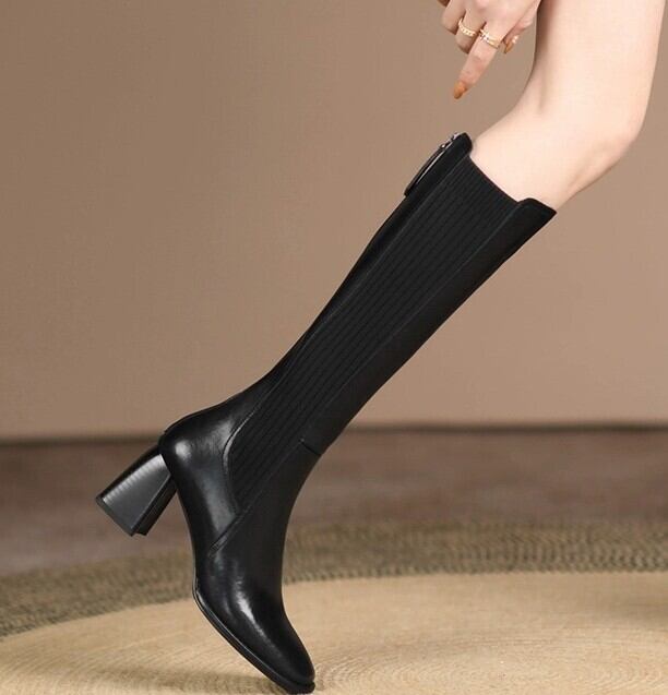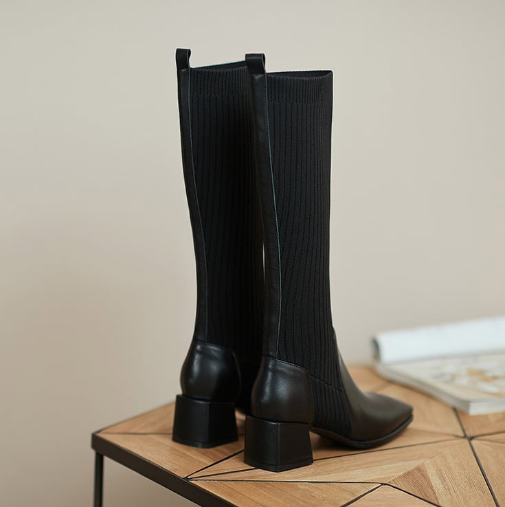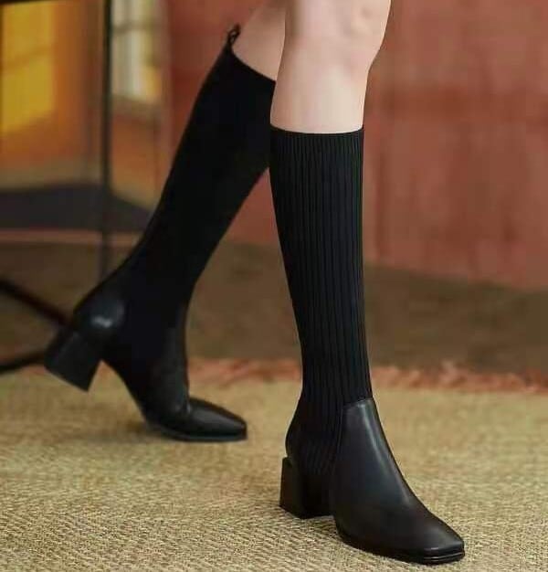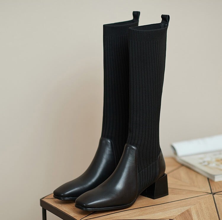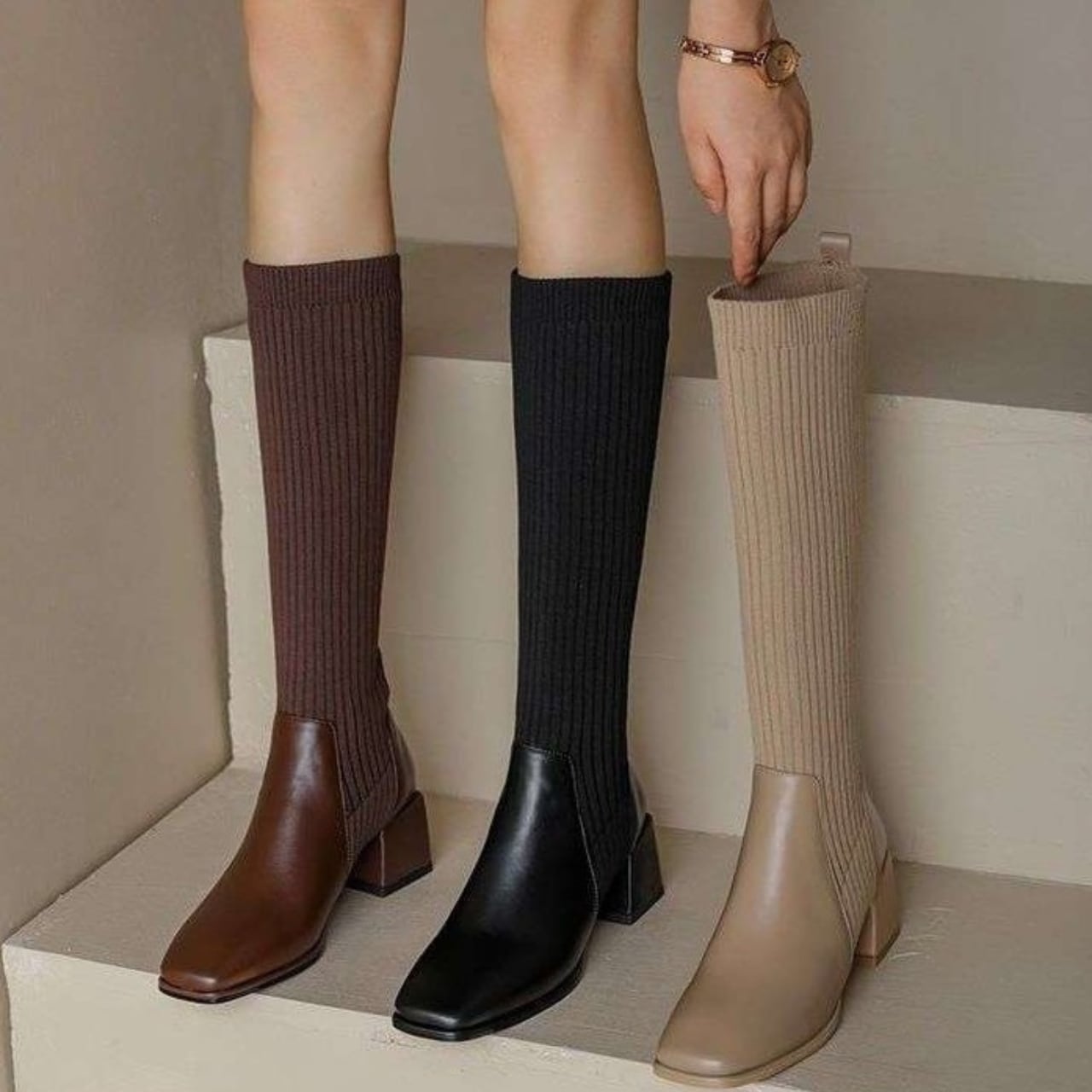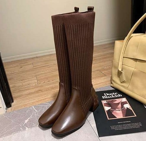 こなれた大人の女性を演出するスクエアトゥーエレガントロングニットブーツ。