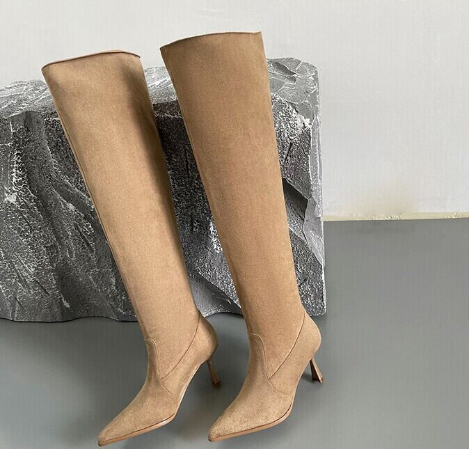 履くだけでこなれた大人の女性を演出するポインテッドトゥエレガントスティレットヒールロングスエードブーツ。