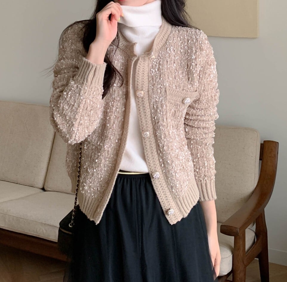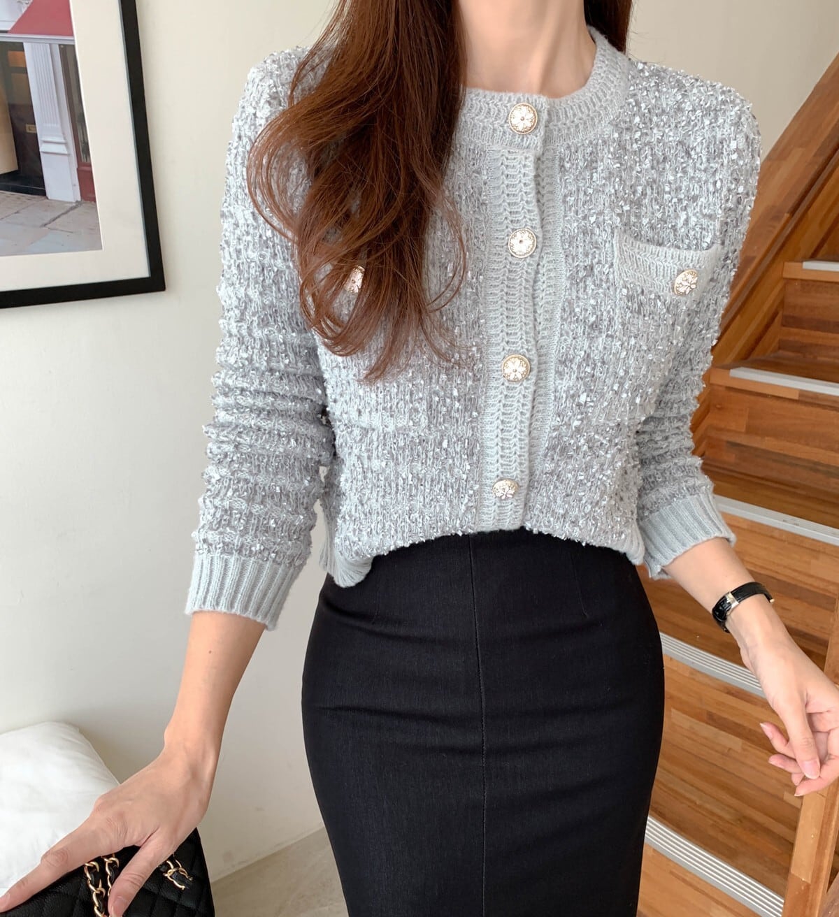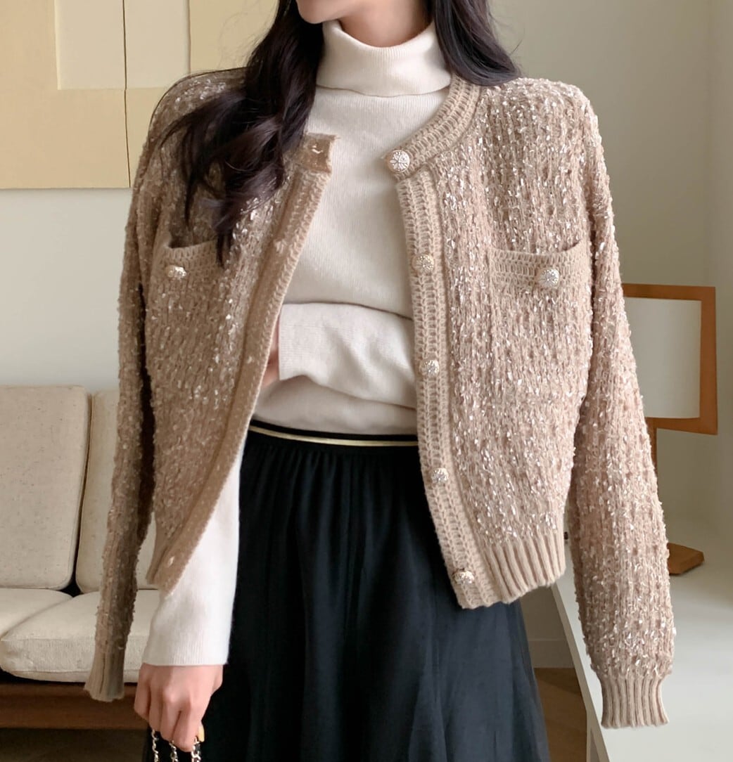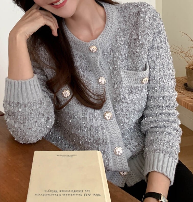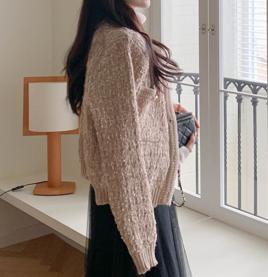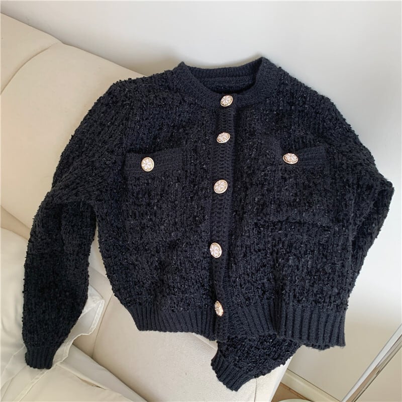 着用するだけでフェミニンな雰囲気が漂うシングルブレストエレガントクロケットレトロニットカーディガン。