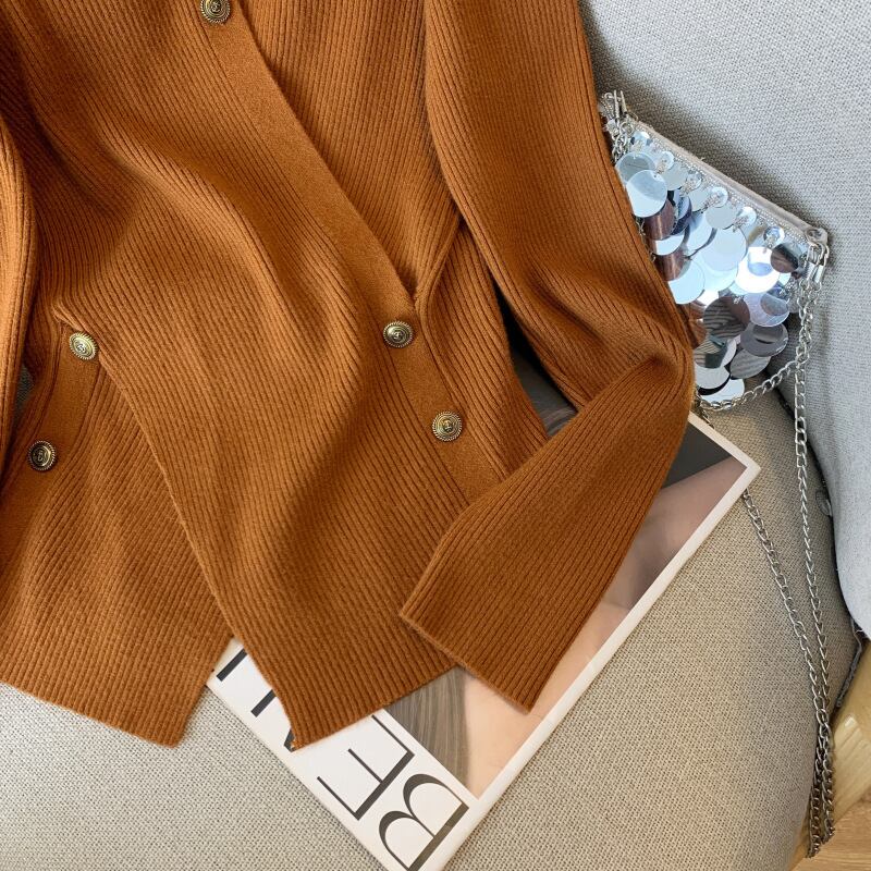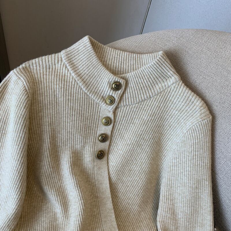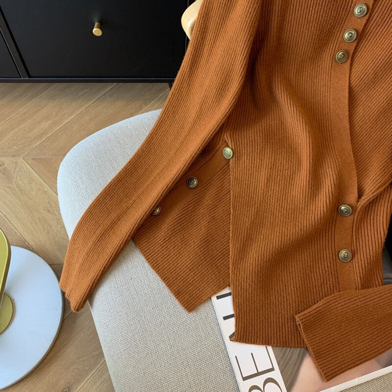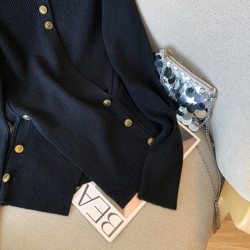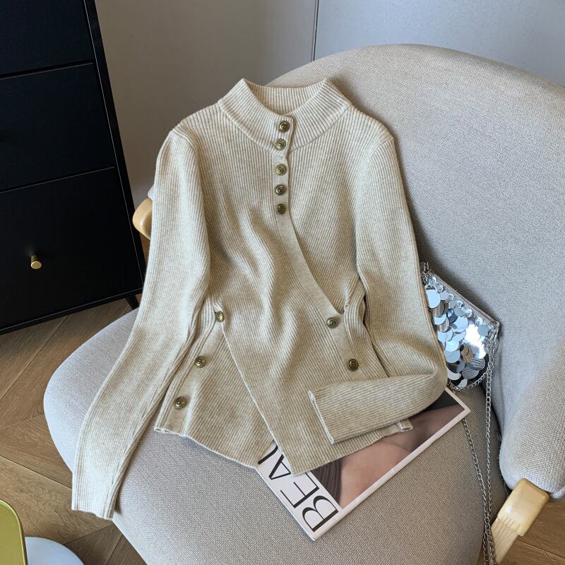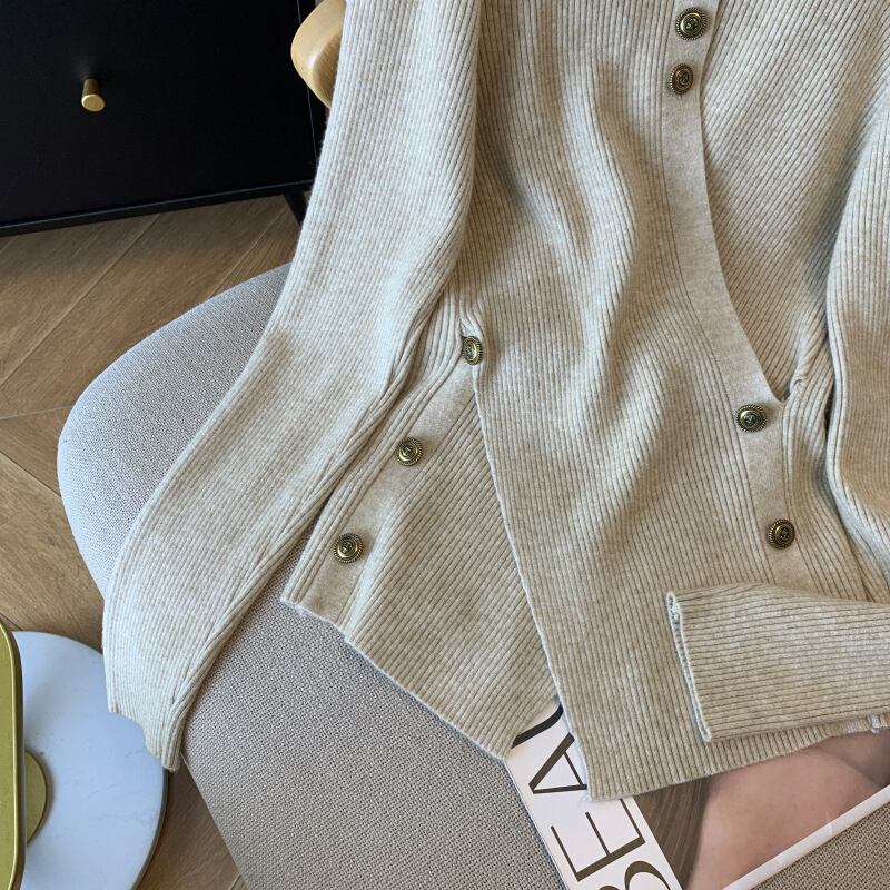 着用するだけでフェミニンな雰囲気が漂うシングルブレストエレガントヘムクロスニット。