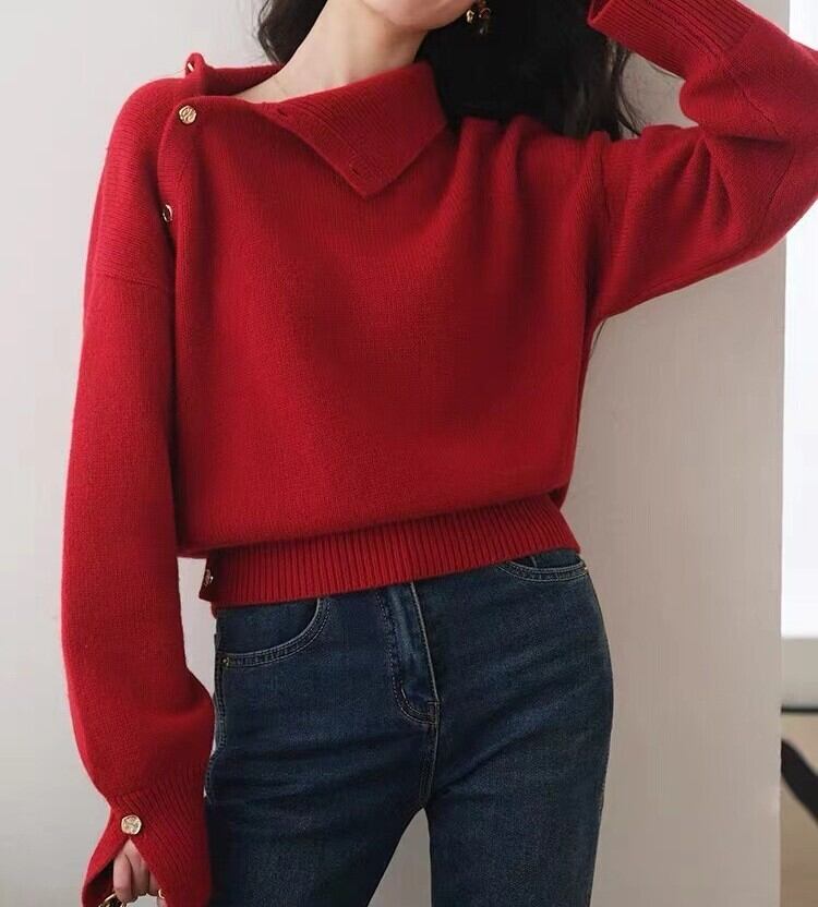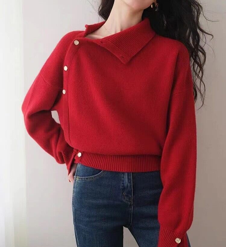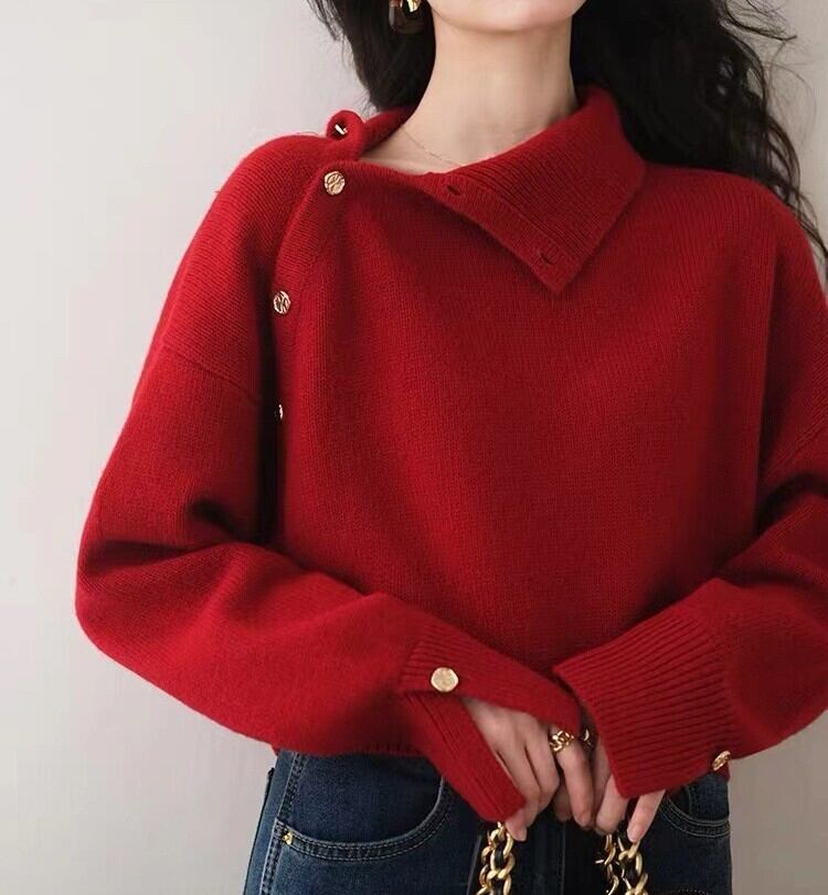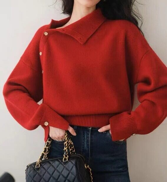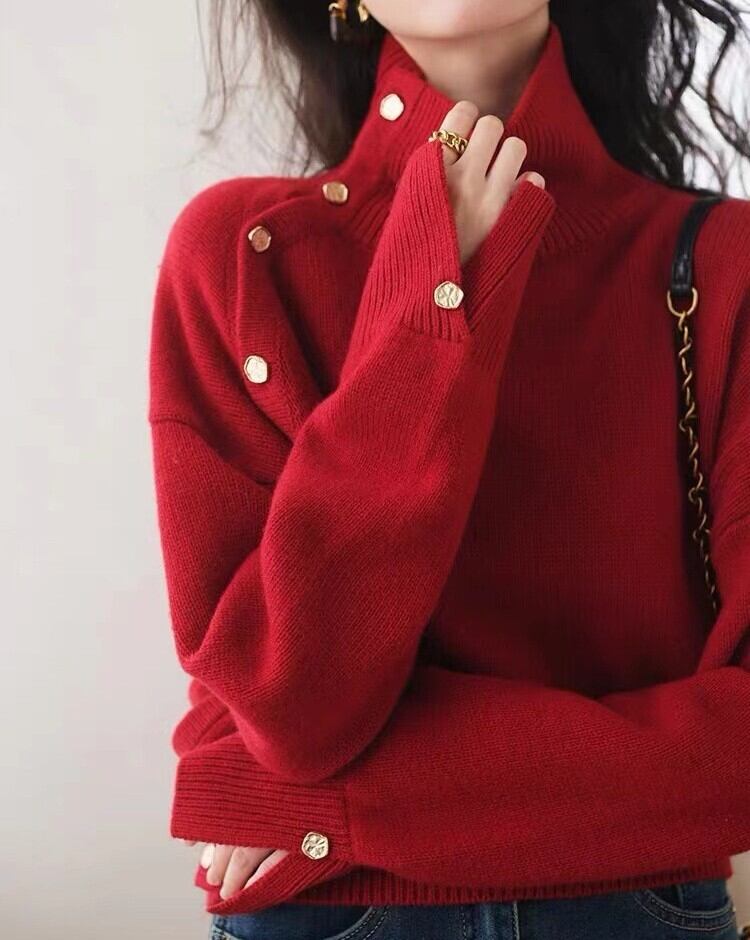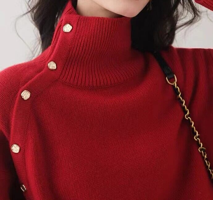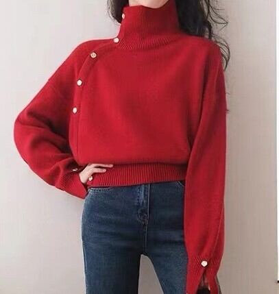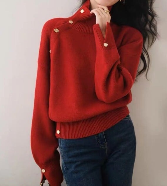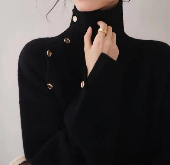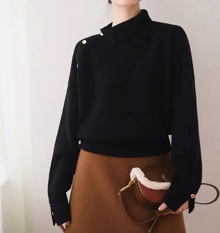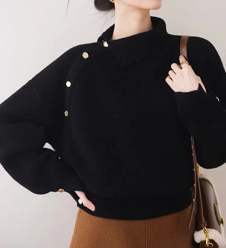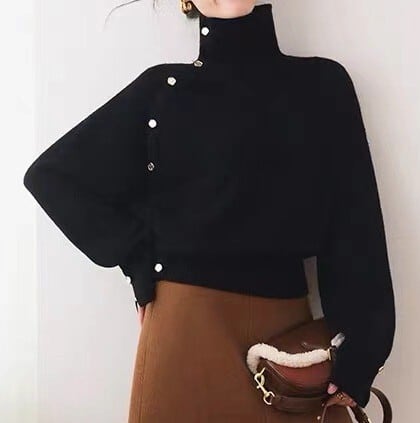 着用するだけで大人可愛い雰囲気が漂うハイネックエレガントショルダーブレストベルベットニット。