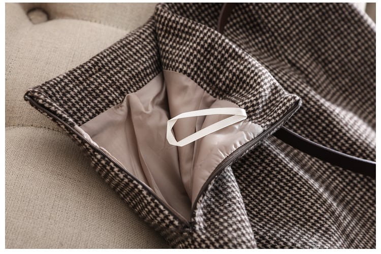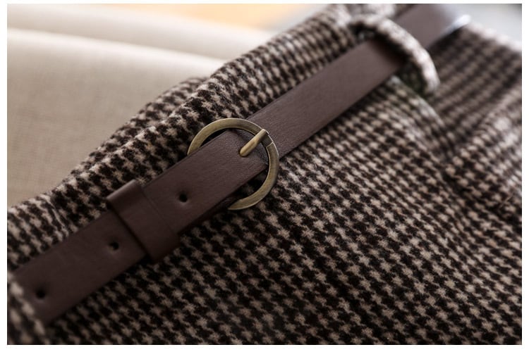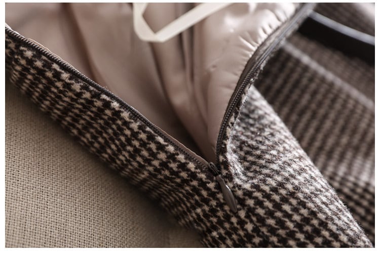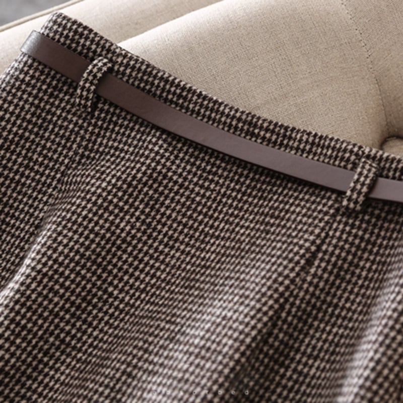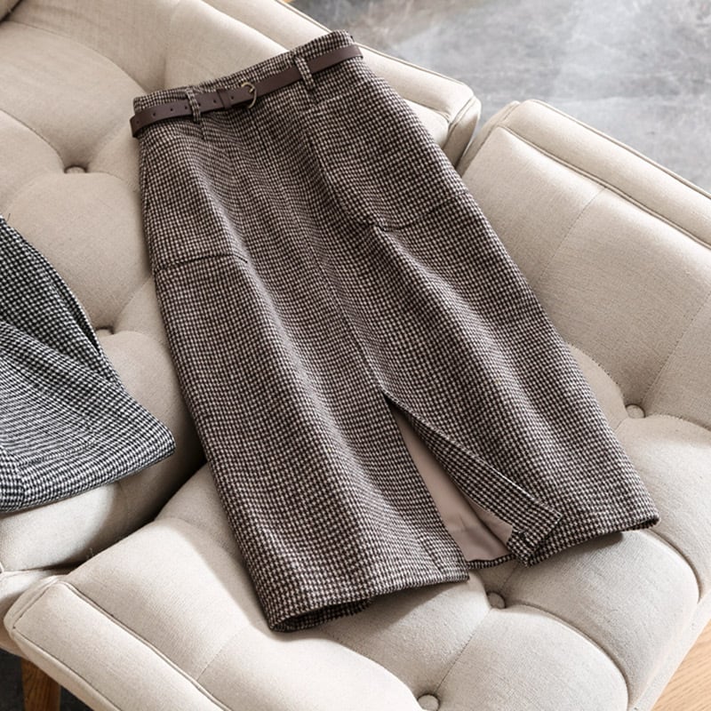 着用するだけでフェミニンな雰囲気が漂うハイウエストエレガントフロントスリット千鳥格子ミドルスカート。