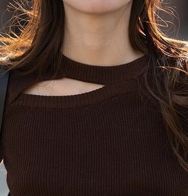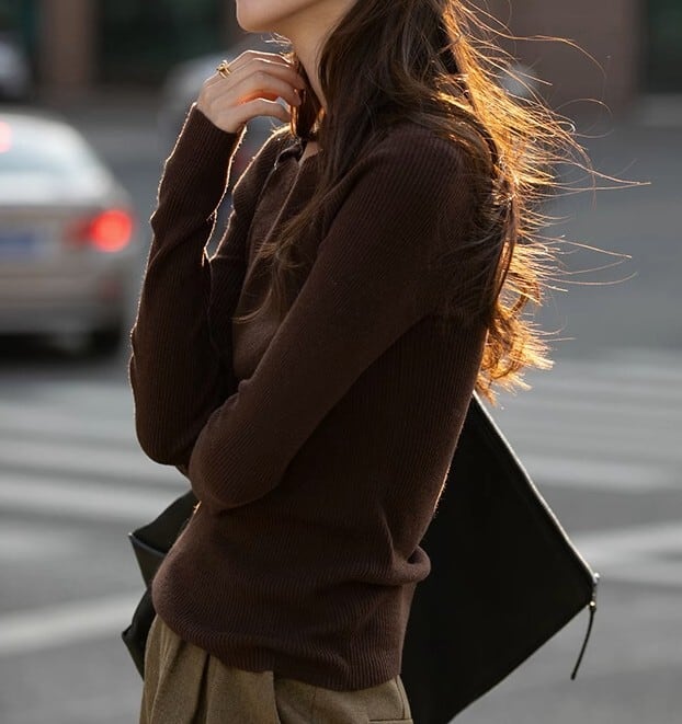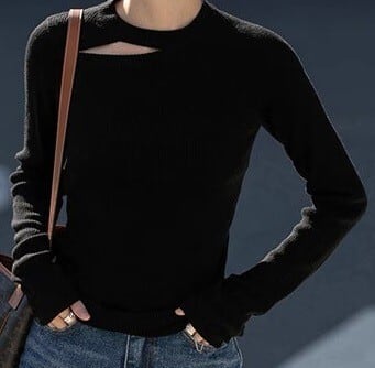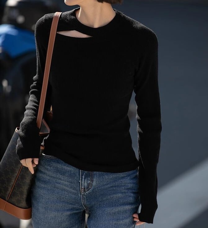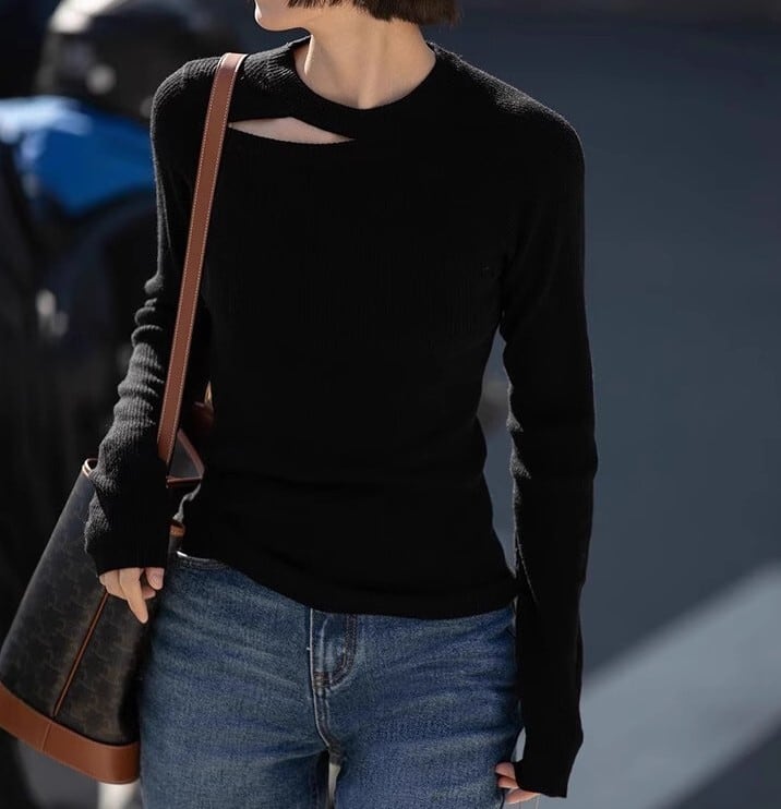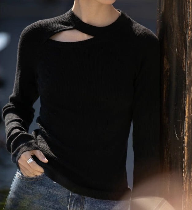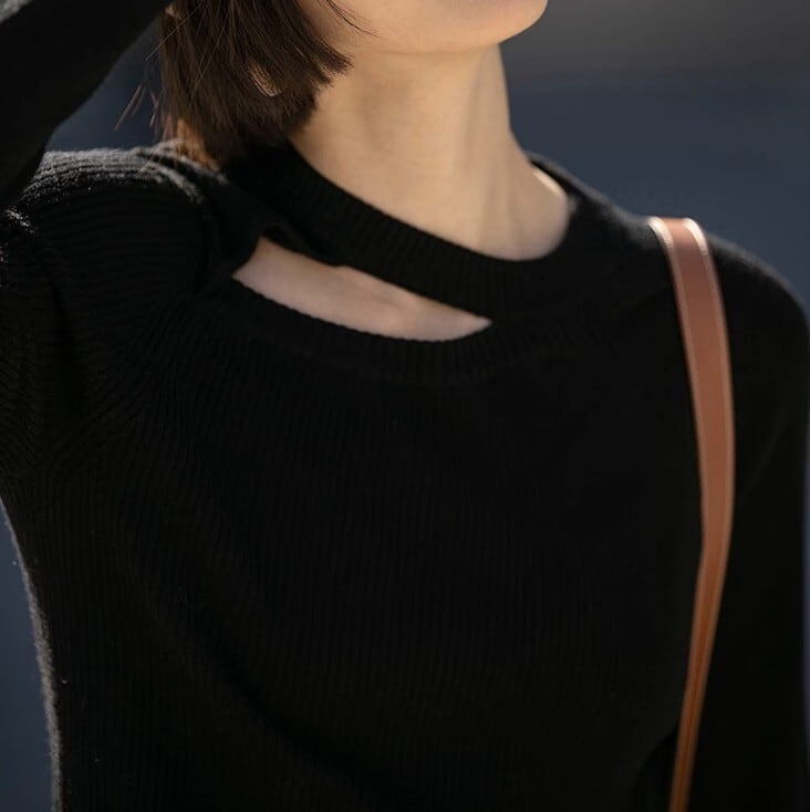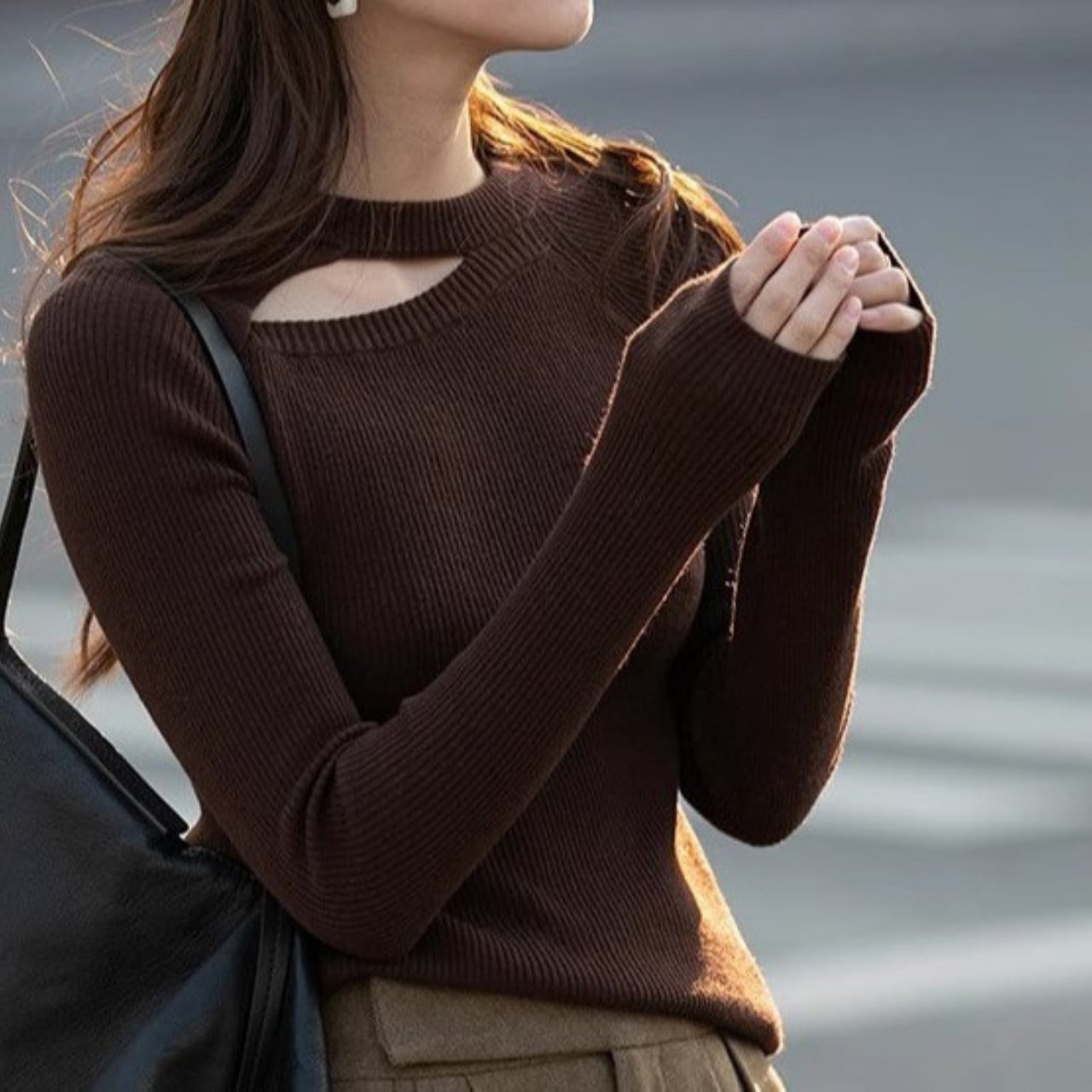 着用するだけで大人可愛い雰囲気が漂うチェストホールエレガントスリムフィットニット。