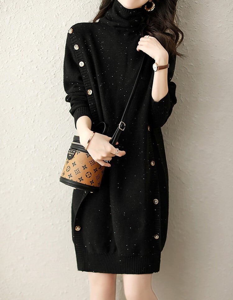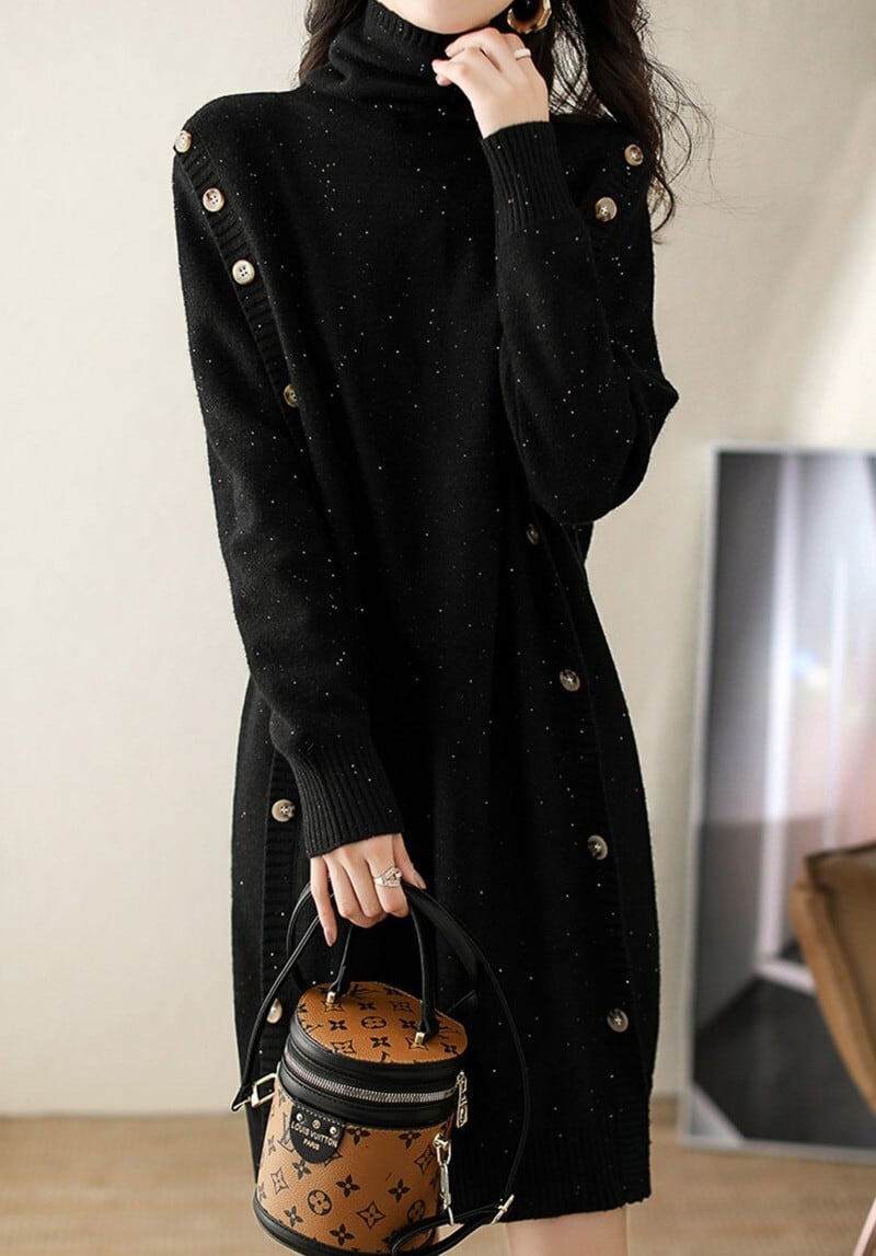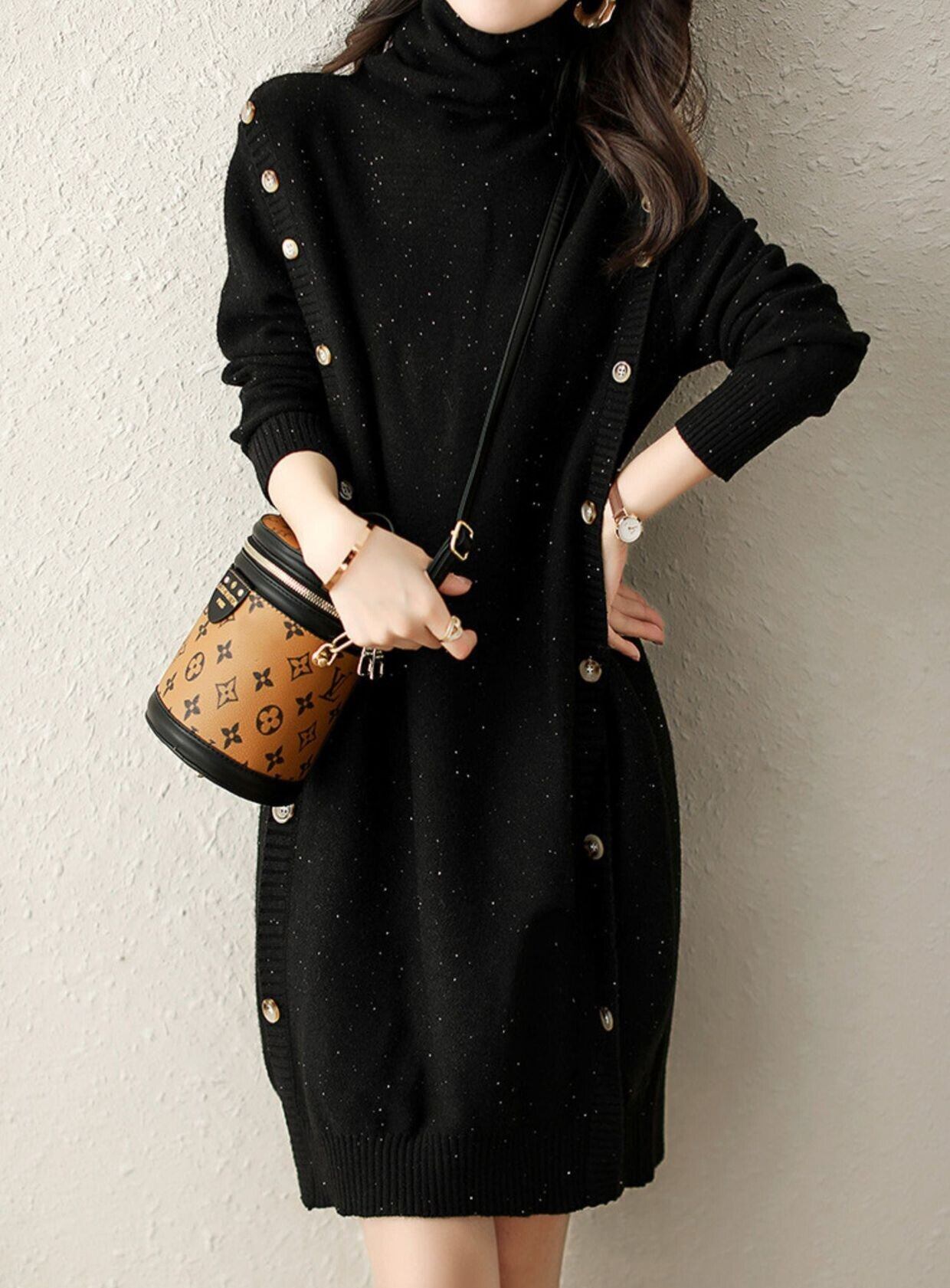 着用するだけでフェミニンな雰囲気が漂うハイネックエレガントダブルブレストミドルニットドレス 。