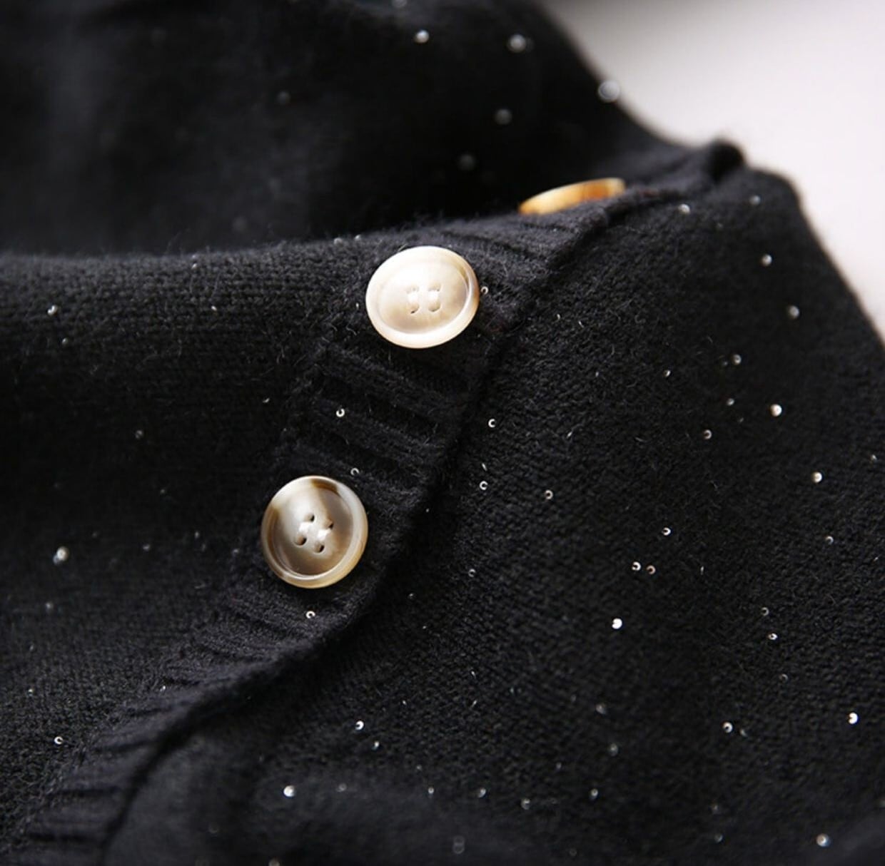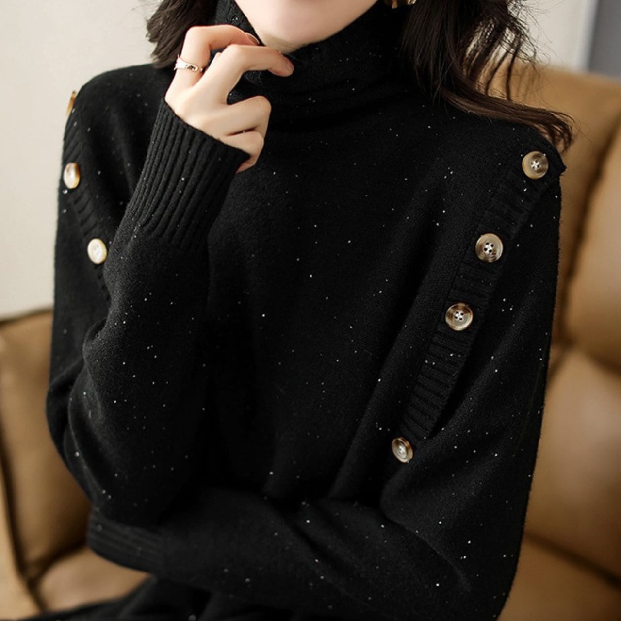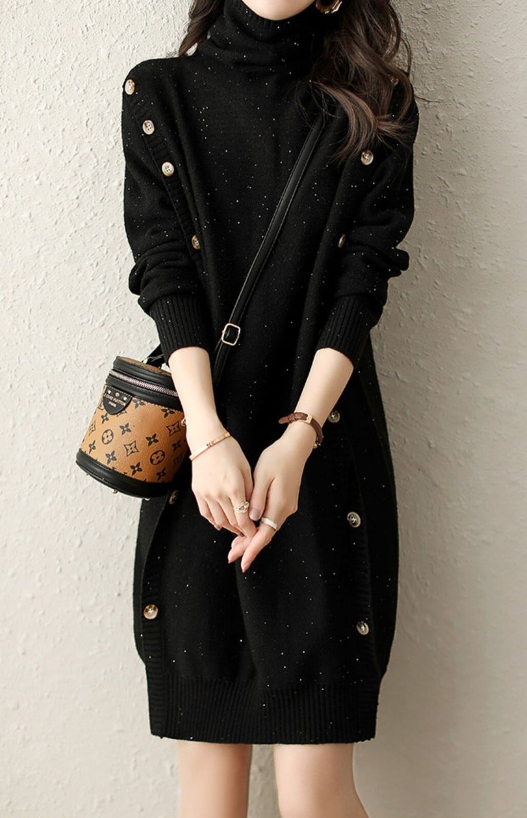 着用するだけでフェミニンな雰囲気が漂うハイネックエレガントダブルブレストミドルニットドレス 。