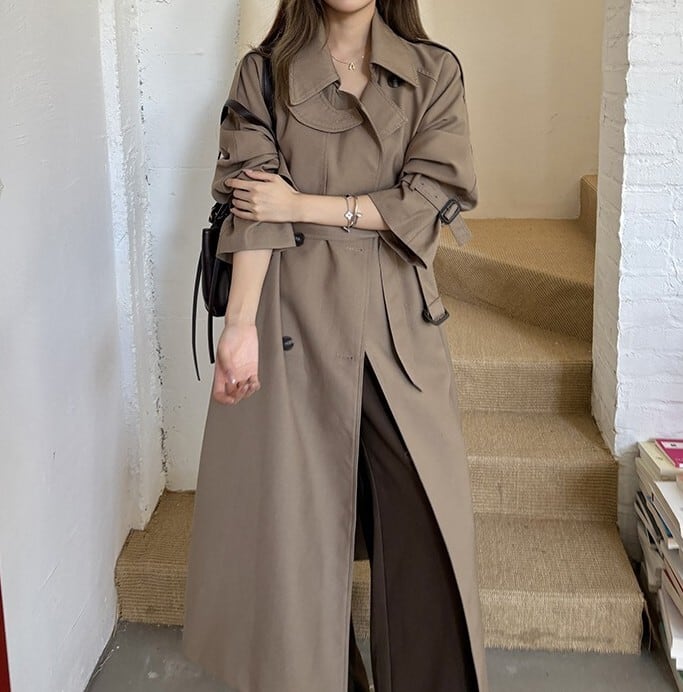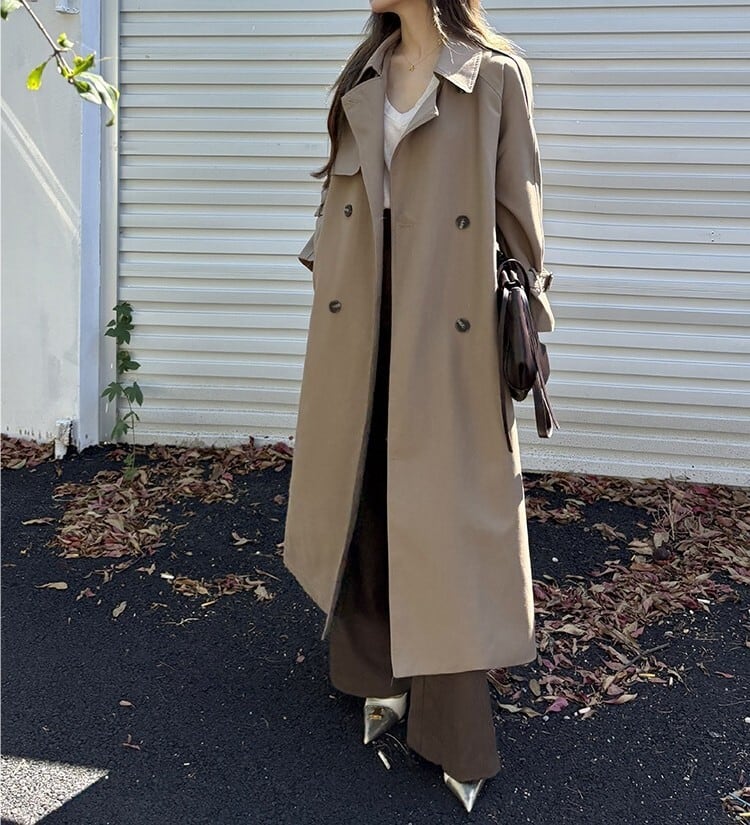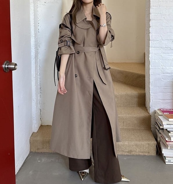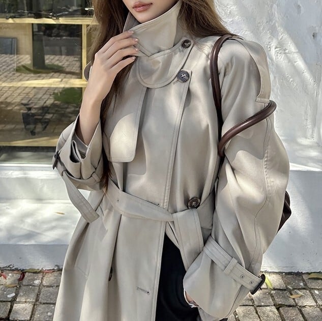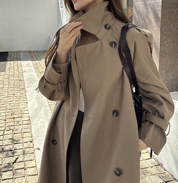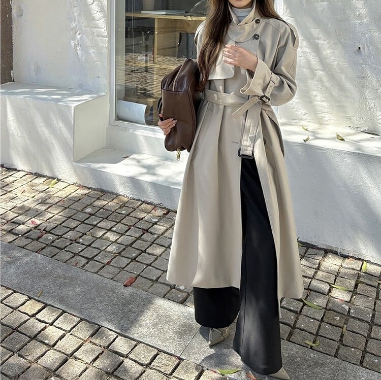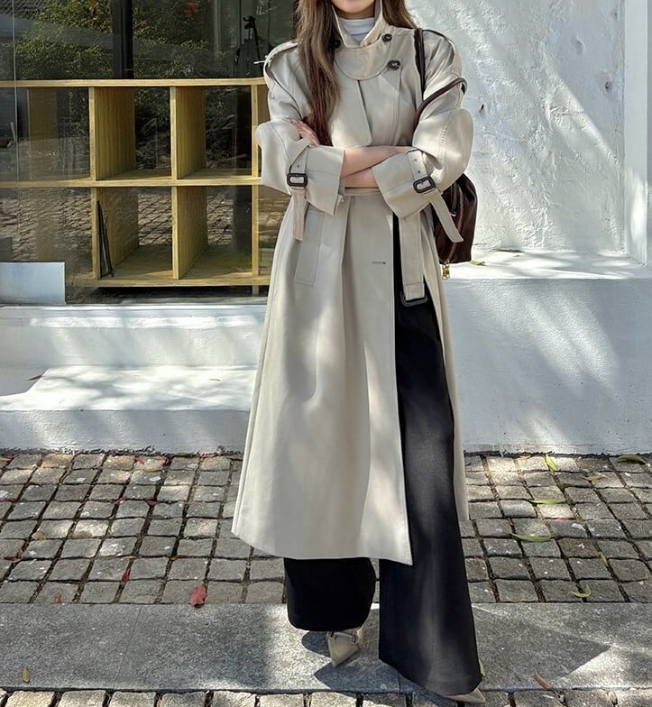 着用するだけでフェミニンな雰囲気が漂うスタンドカラーエレガントダブルブレストストラップロングトレンチコート。