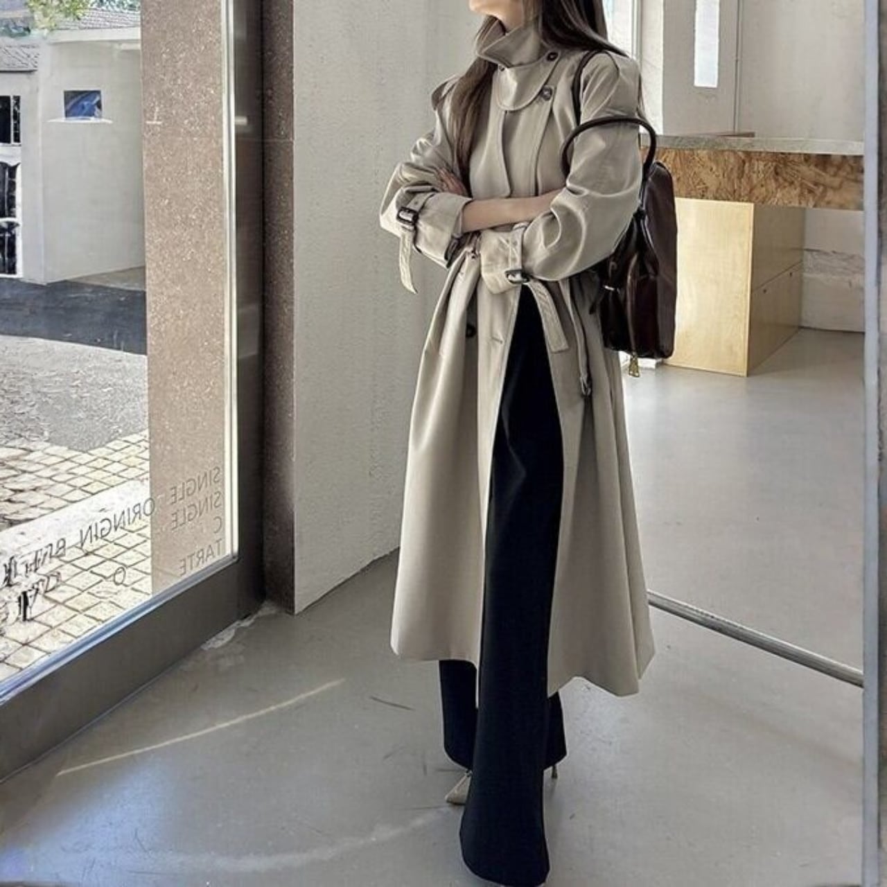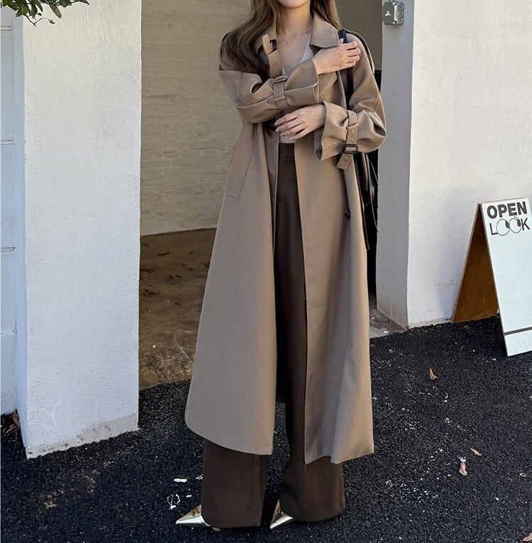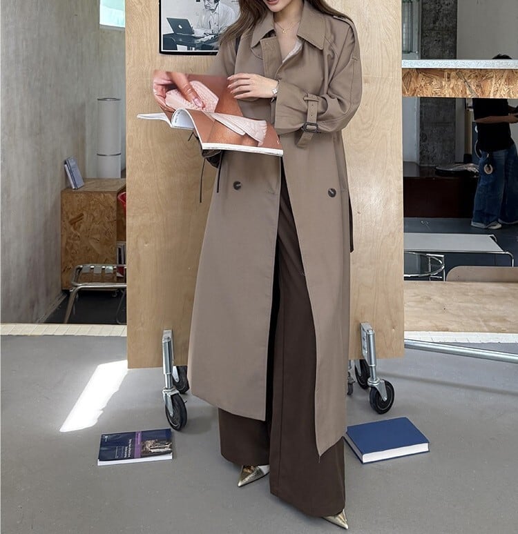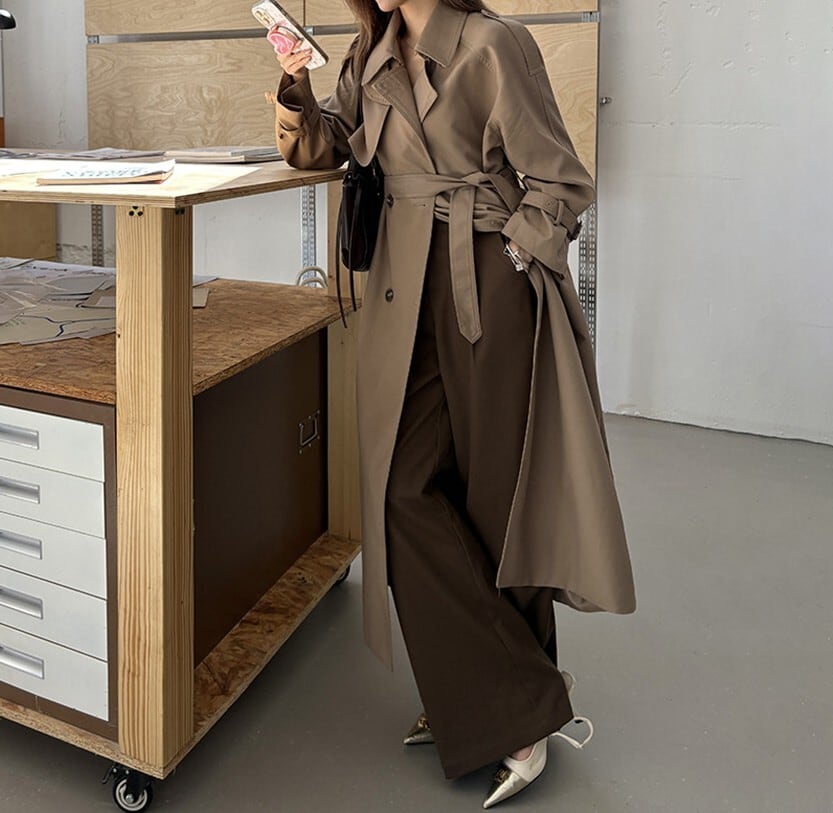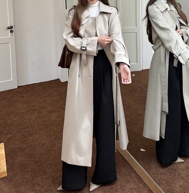 着用するだけでフェミニンな雰囲気が漂うスタンドカラーエレガントダブルブレストストラップロングトレンチコート。