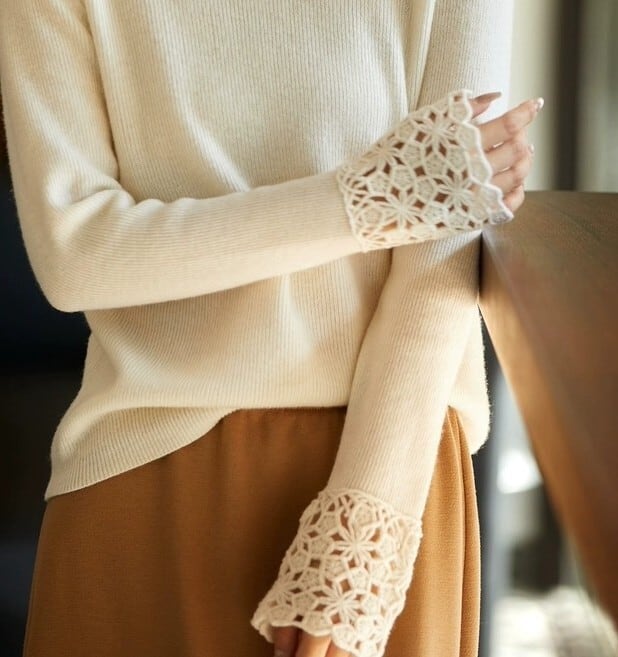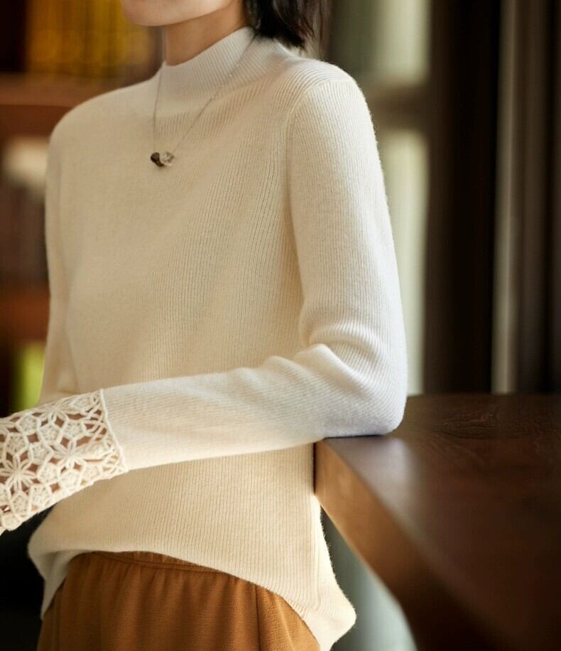 Half high neck elegant sleeve lace slim knit ( 3color )