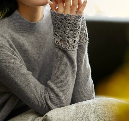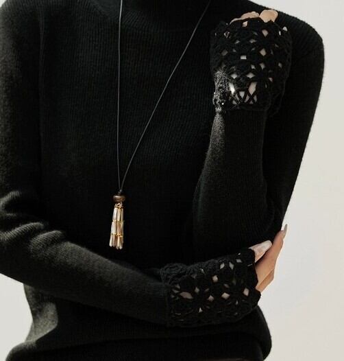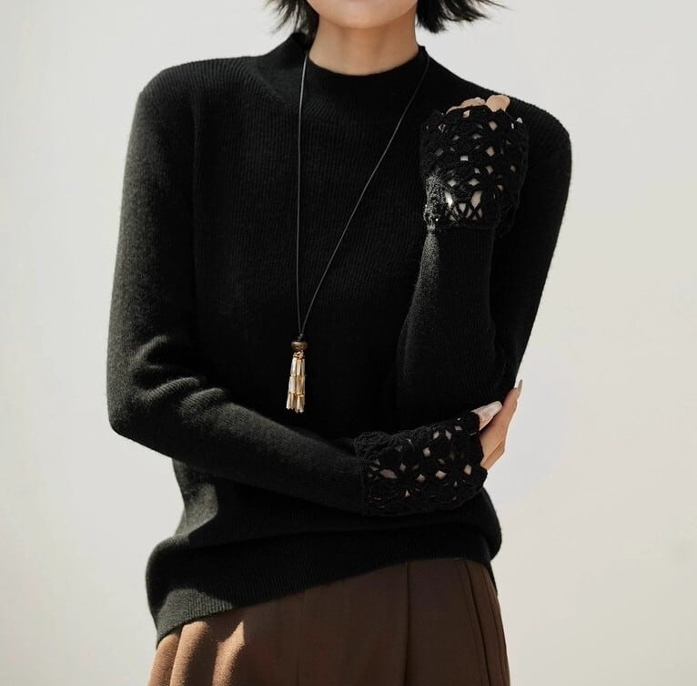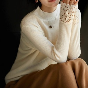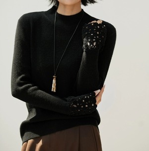 着用するだけでフェミニンな雰囲気が漂うハーフハイネックエレガントスリーブレーススリムニット。
