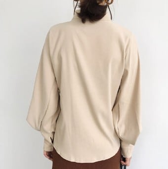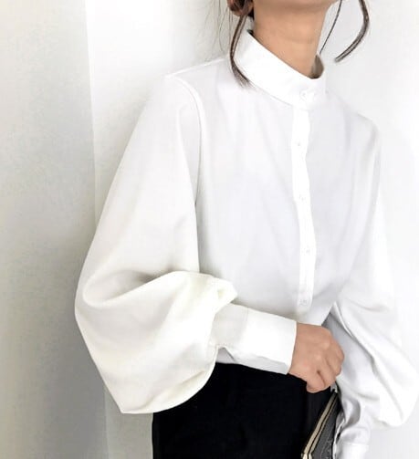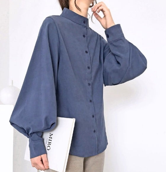 着用するだけで大人可愛い雰囲気が漂うスタンドカラーエレガントランタンスリーブブラウス。