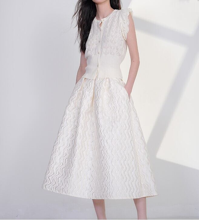 着用するだけでエレガントでフェミニンな雰囲気が漂うハイウエストエレガントウェーブステッチスイングチュールスカート。