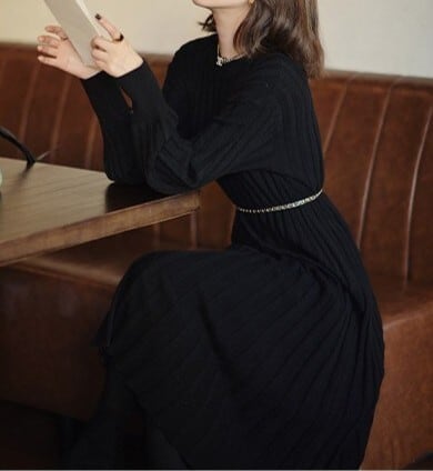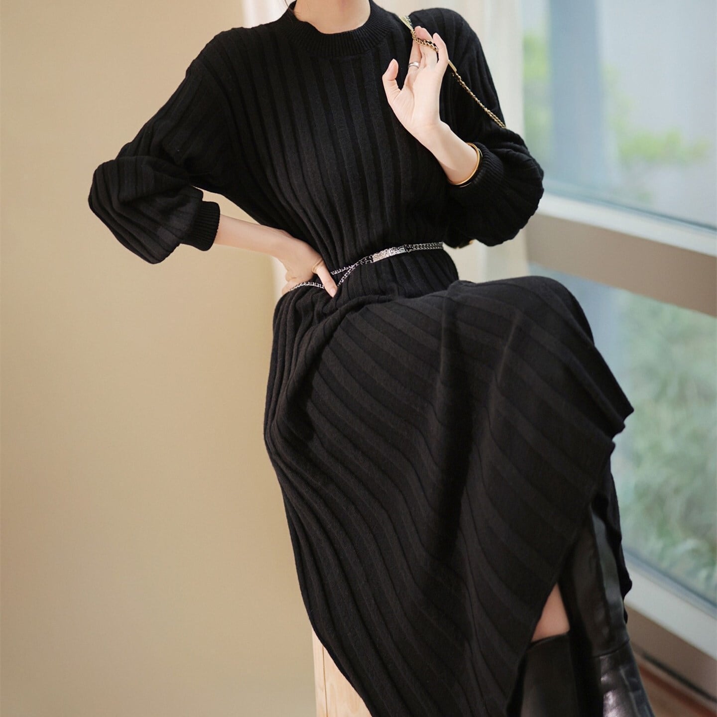 着用するだけでフェミニンな雰囲気が漂うラウンドネックエレガントスイングロングニットドレス。