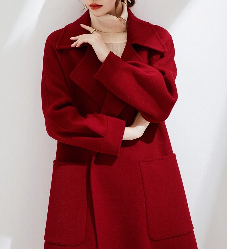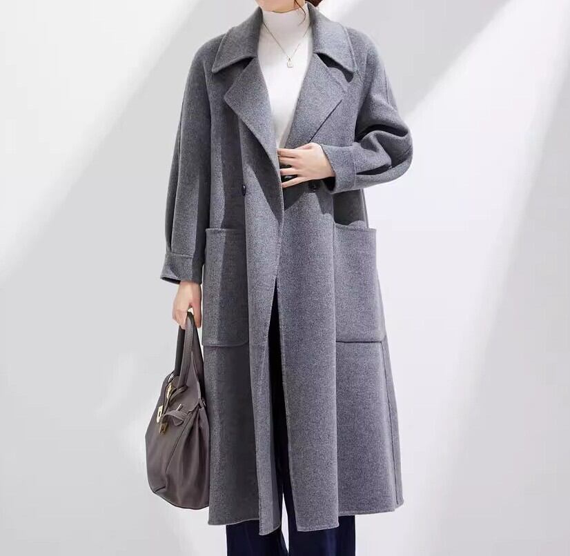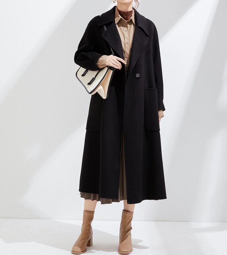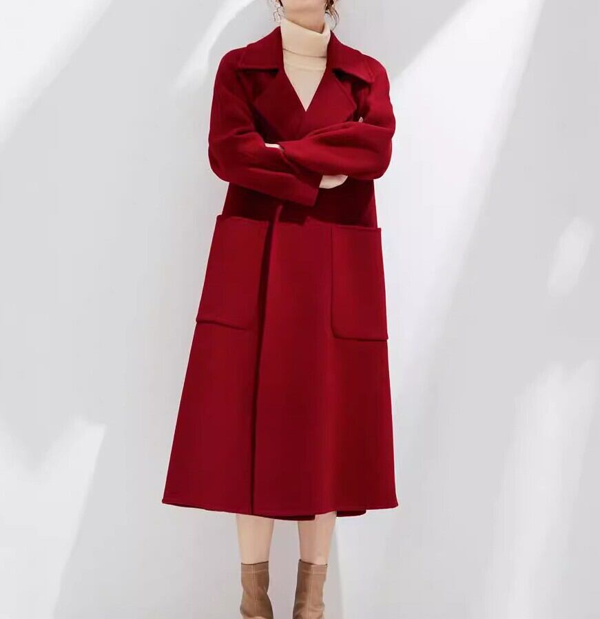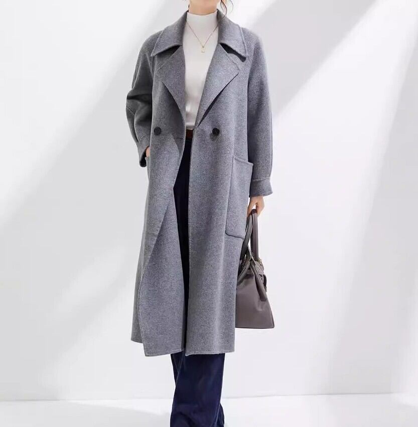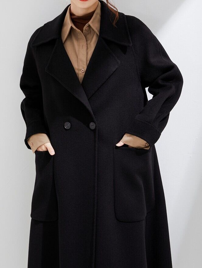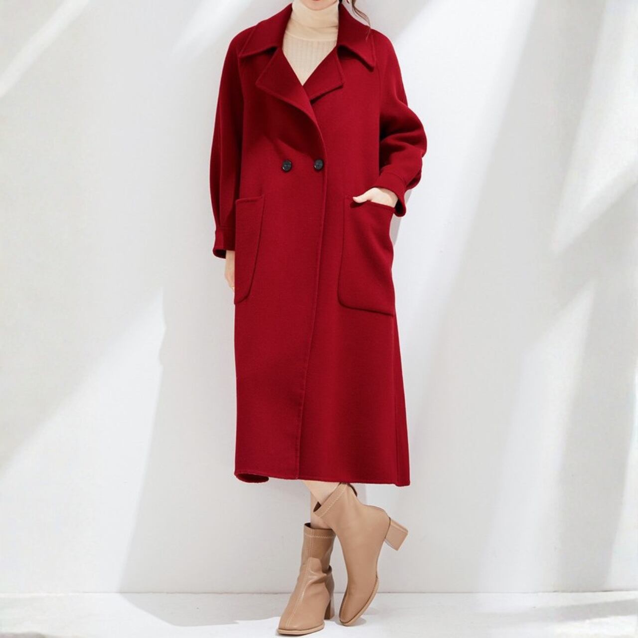 羽織るだけでエレガントでフェミニンな雰囲気が漂うスーツカラーエレガントダブルブレストスリムウールコート。