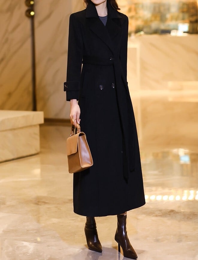 羽織るだけでエレガントでフェミニンな雰囲気が漂うスーツカラーエレガントダブルブレストストラップロングコート。
