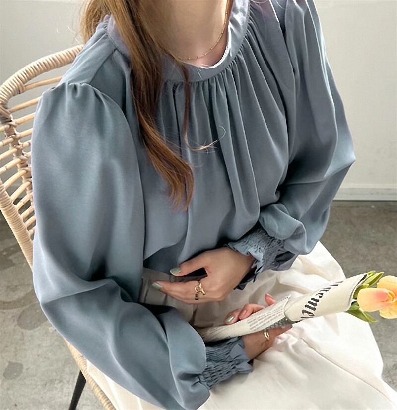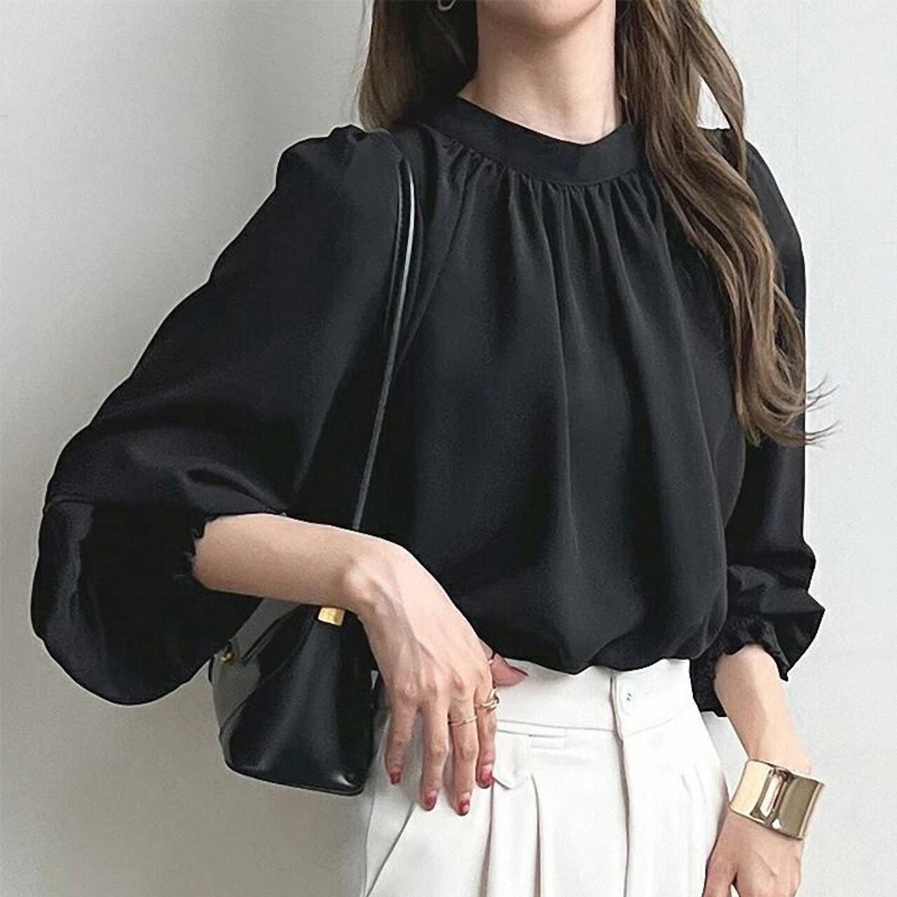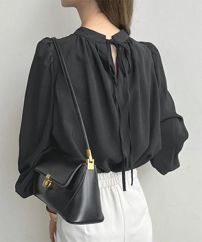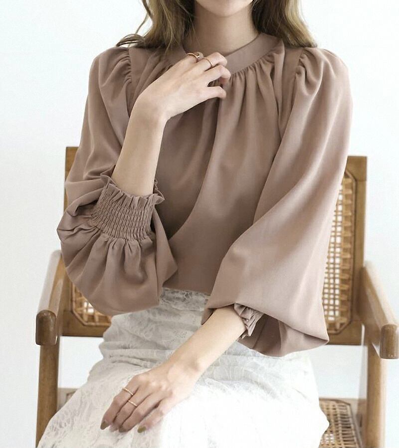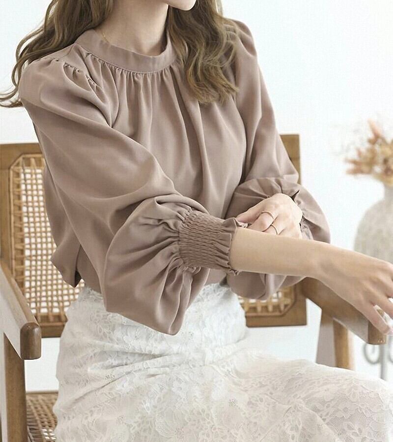 着用するだけで大人可愛い雰囲気が漂うスタンドカラーエレガントパフスリーブシフォンシャツ。