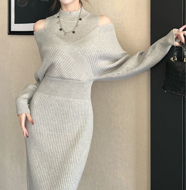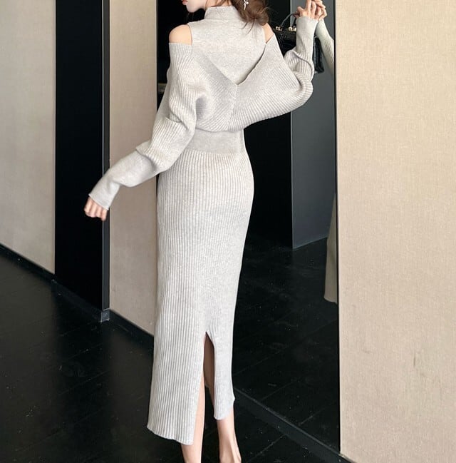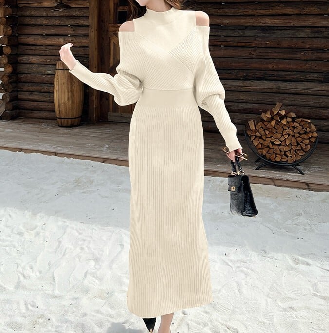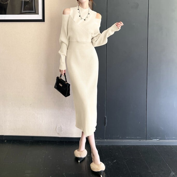 Half high neck elegant off shoulder long knit dress