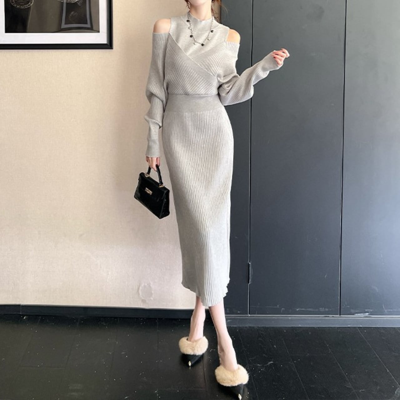 Half high neck elegant off shoulder long knit dress ( 2color )