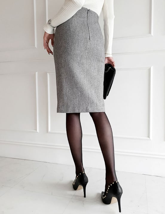 High waist elegant front slit hip cover herringbone skirt ( 2color )
