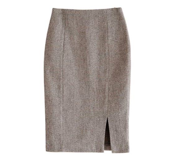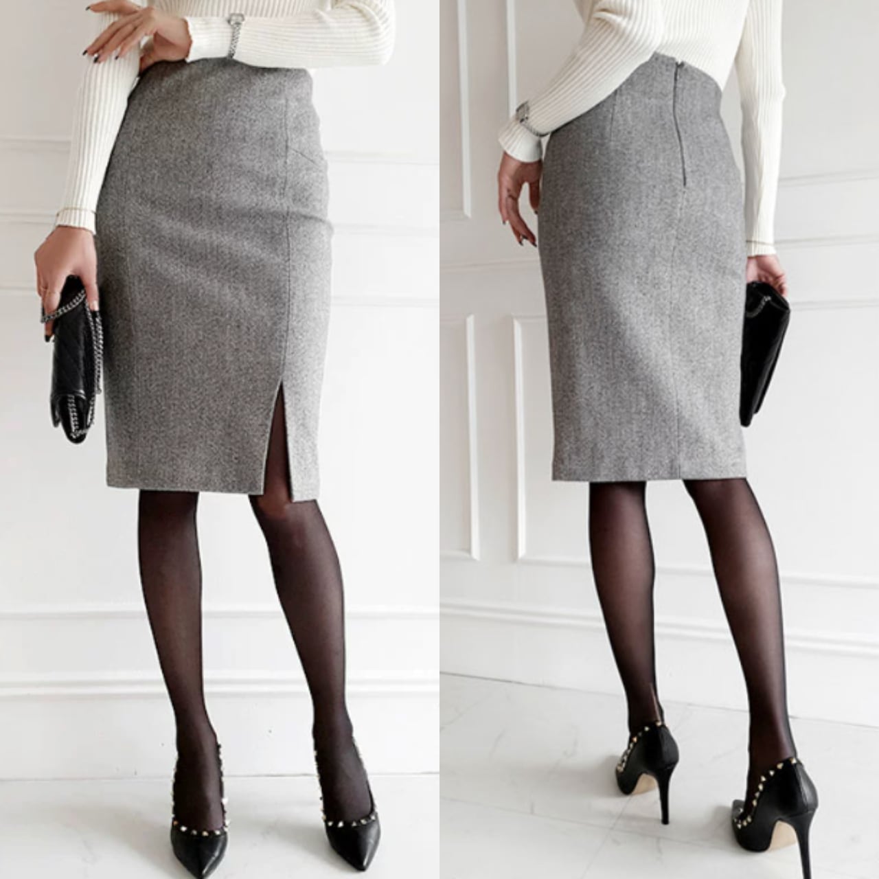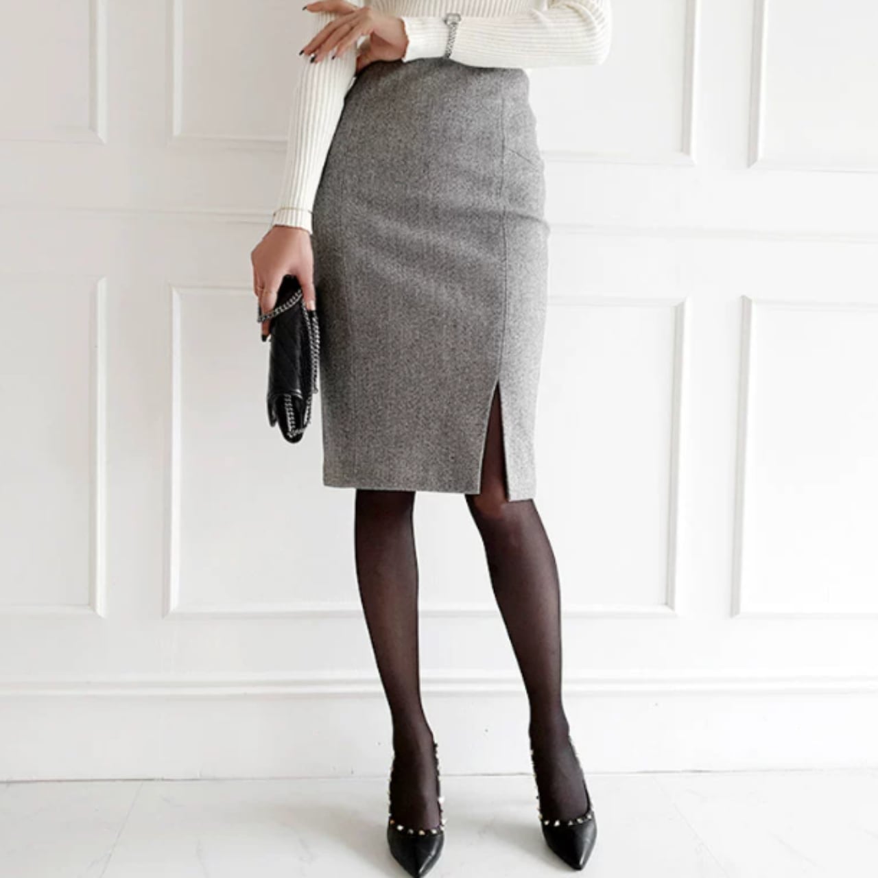 着用するだけでフェミニンな雰囲気が漂うハイウエストエレガントフロントスリットヒップカバーヘリンボーンスカート。