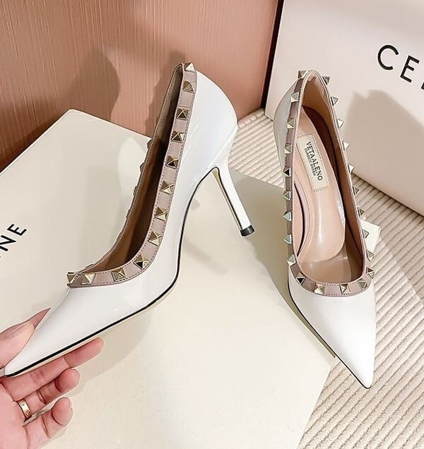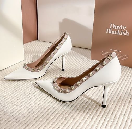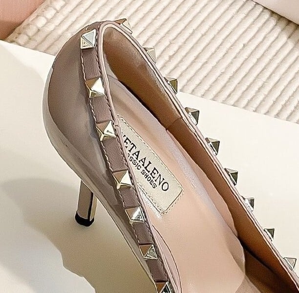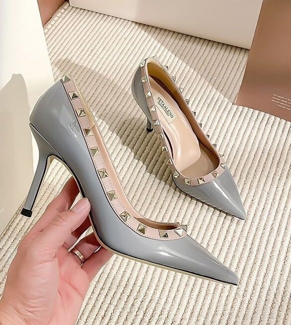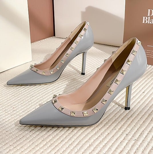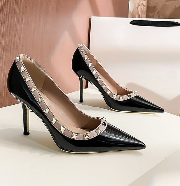 足元をフェミニンに演出するスタッズステッチエレガントスティレットパンプス。