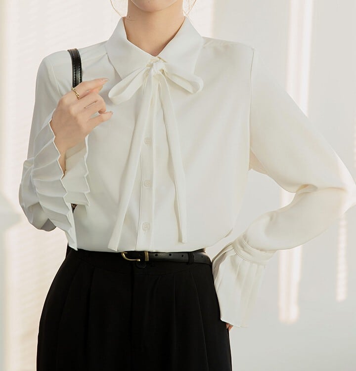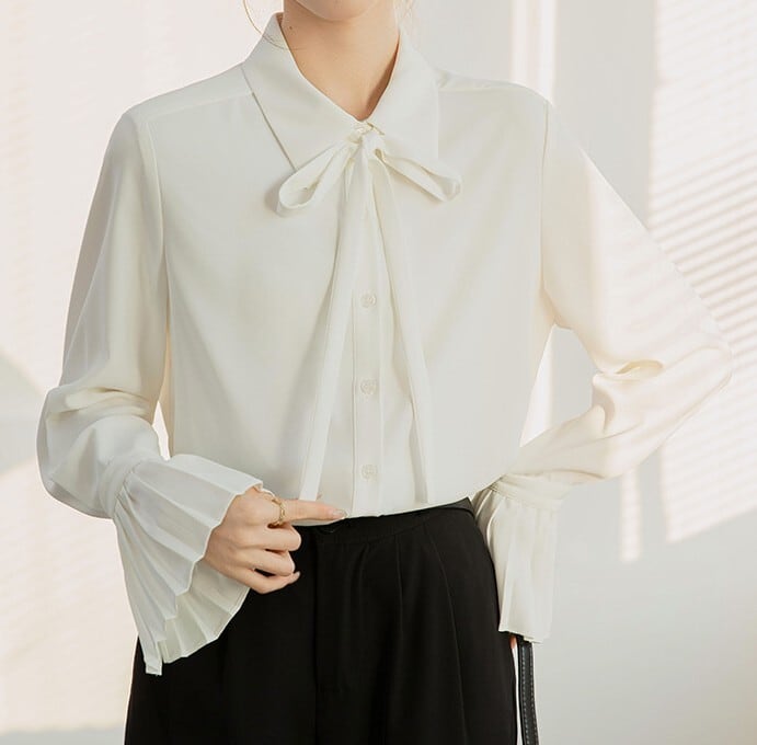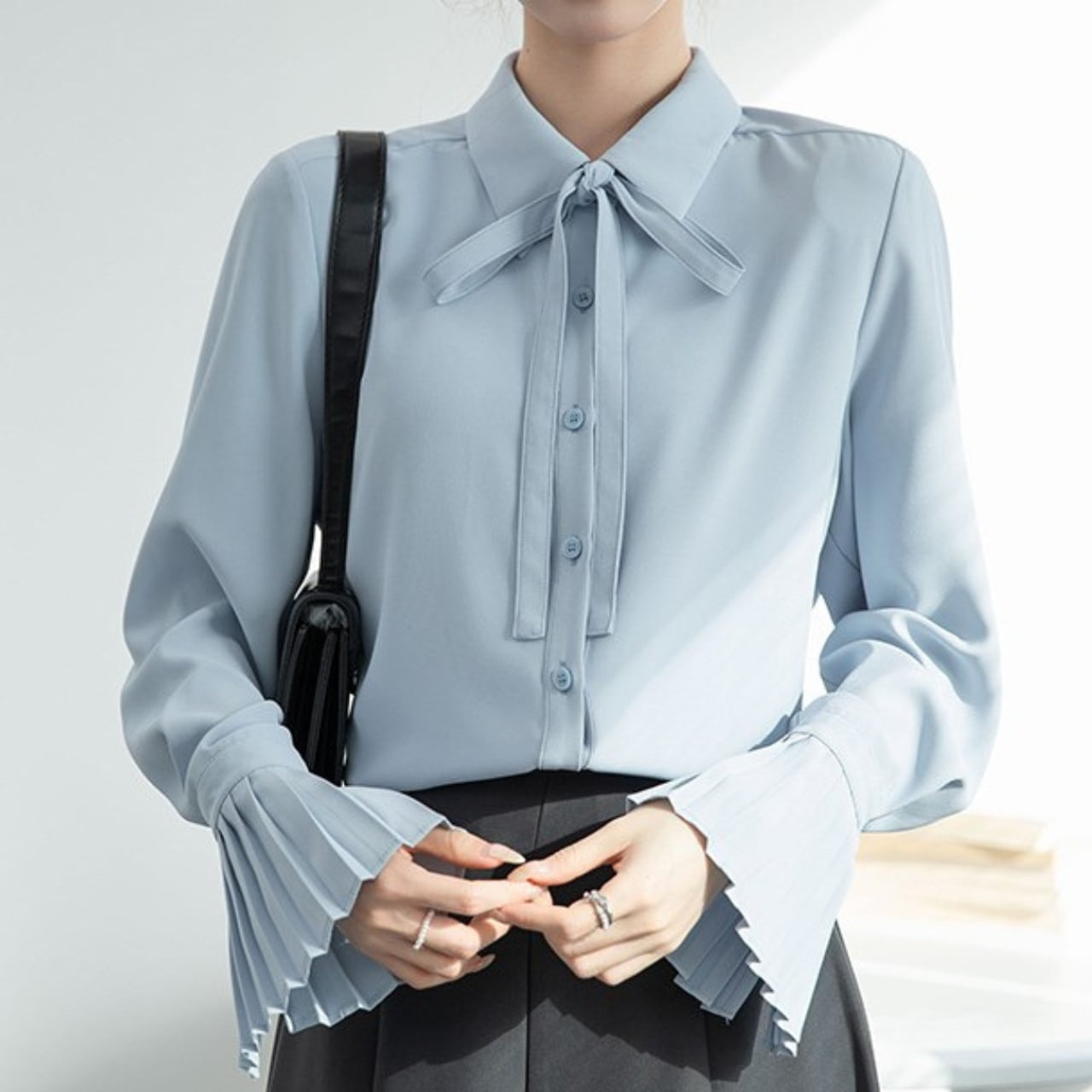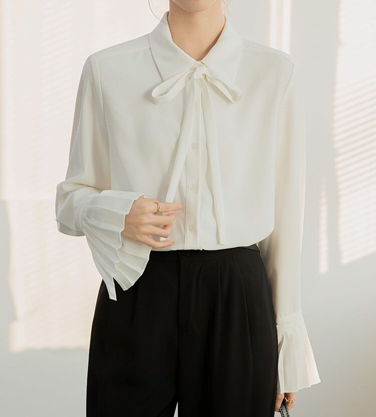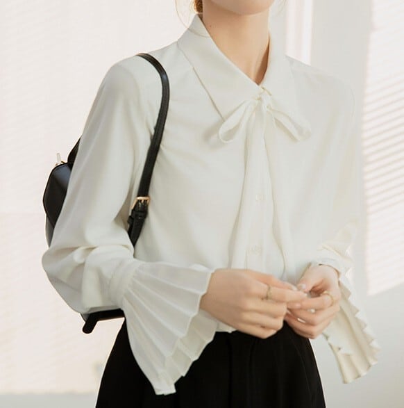 着用するだけで大人可愛い雰囲気が漂うチェストリボンエレガントフレアスリーブシフォンブラウス。