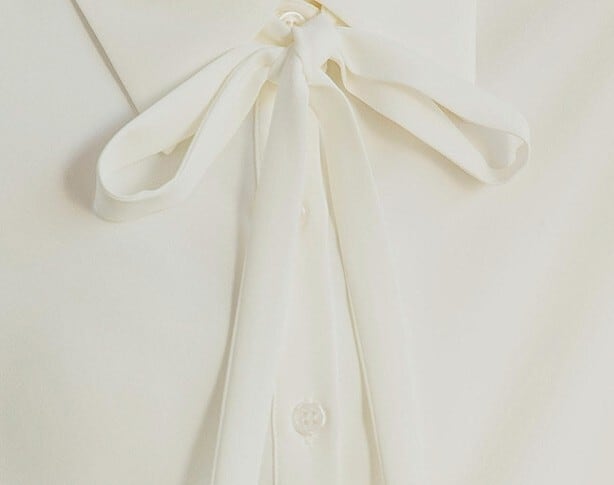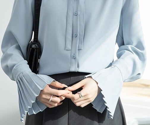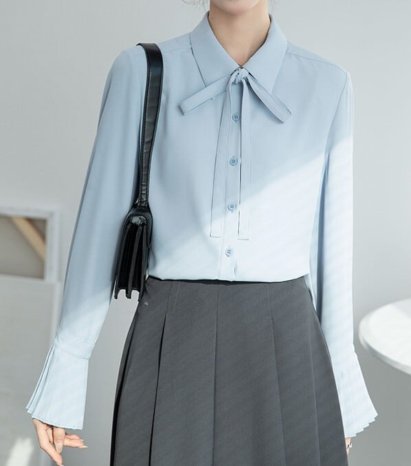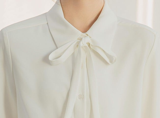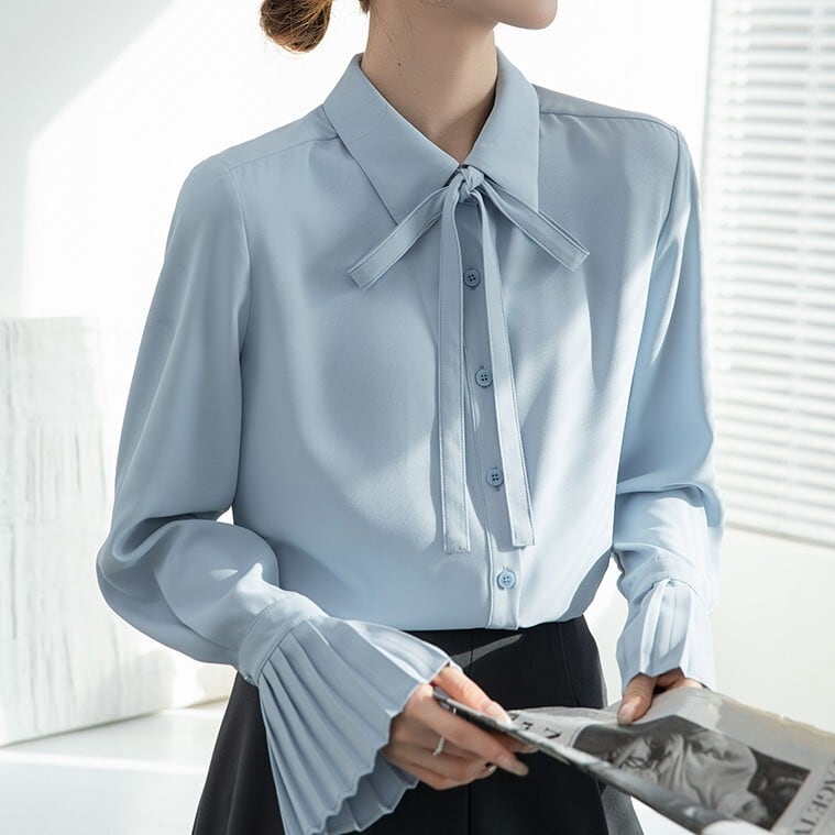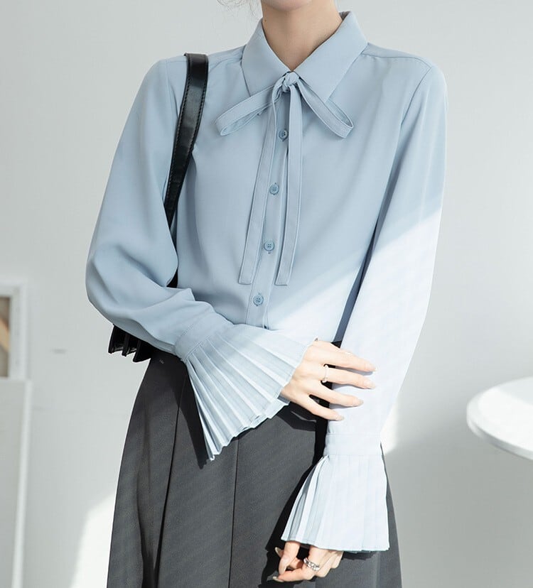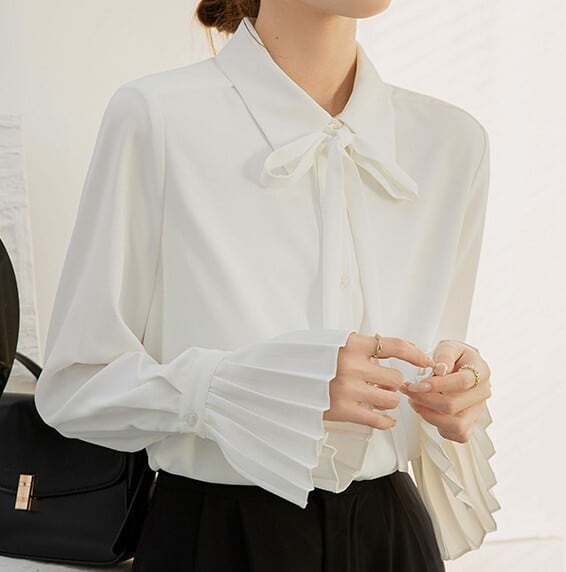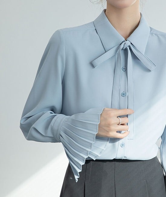 着用するだけで大人可愛い雰囲気が漂うチェストリボンエレガントフレアスリーブシフォンブラウス。