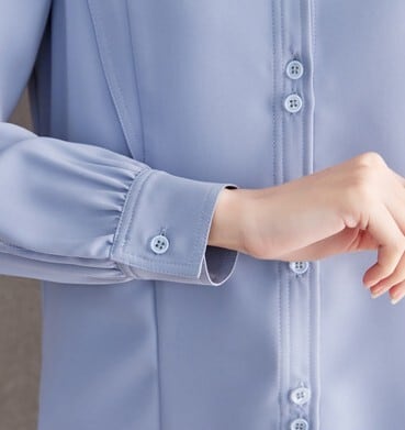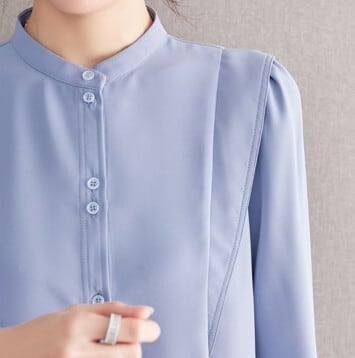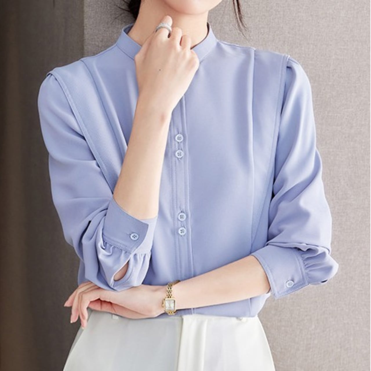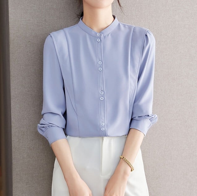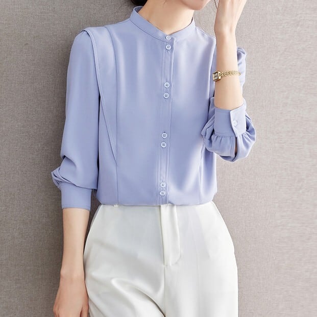 着用するだけで大人可愛い雰囲気が漂うスタンドカラーエレガントスリムシフォンブラウス 。