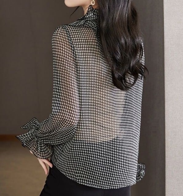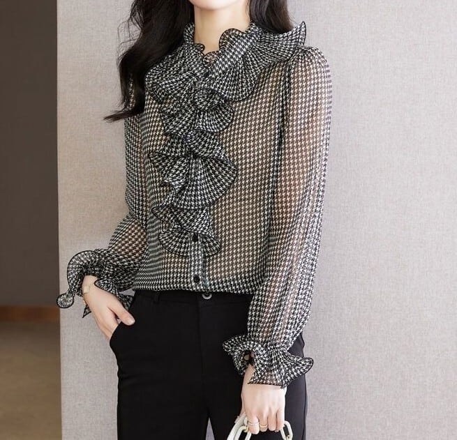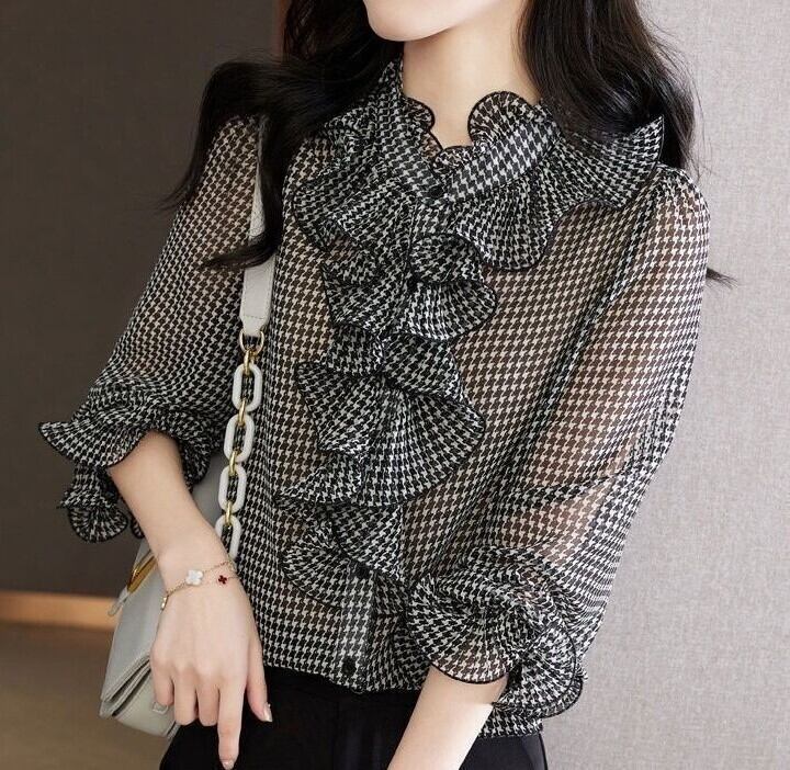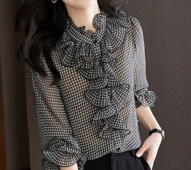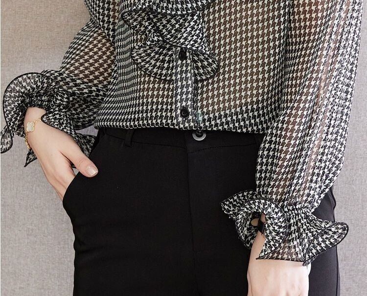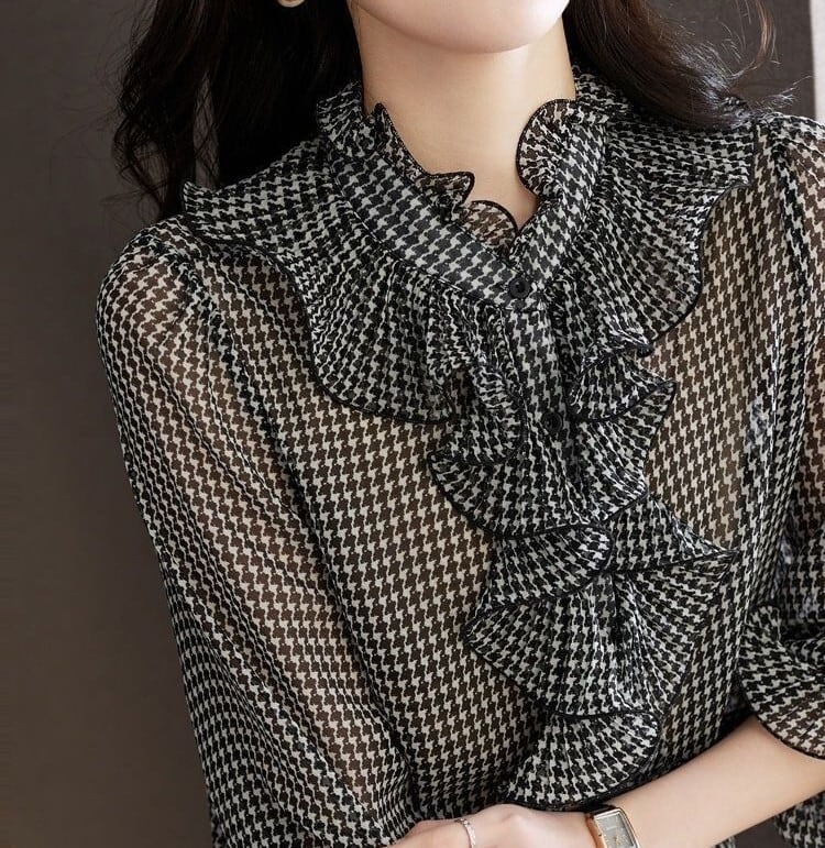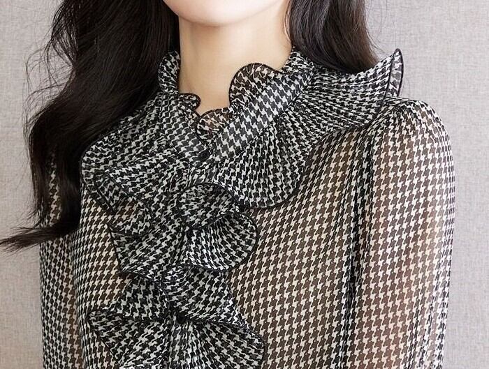 着用するだけで大人可愛い雰囲気が漂うチェストラッフルエレガント千鳥格子シフォンブラウス。