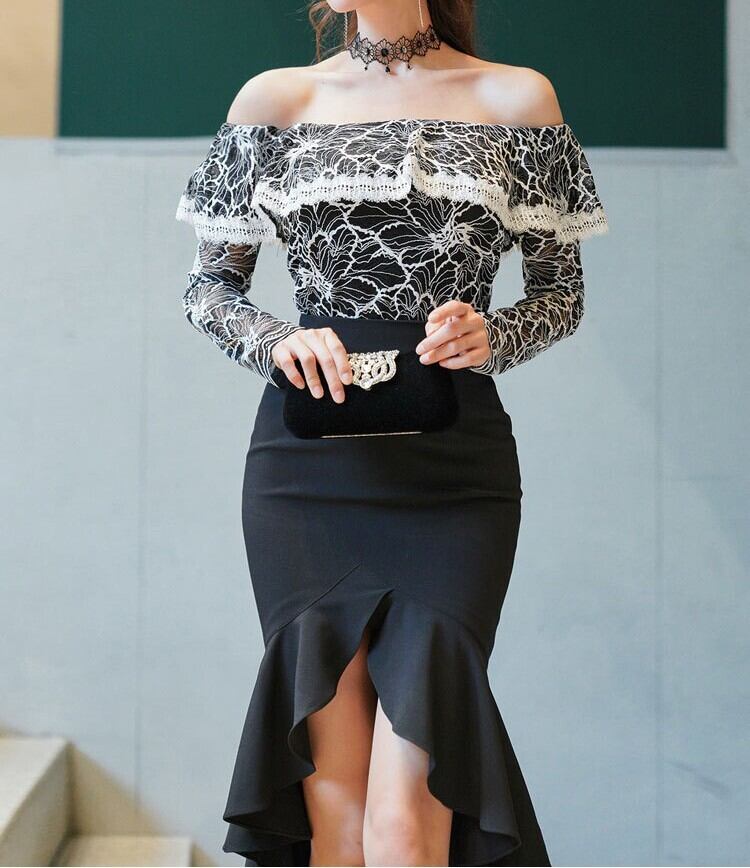 着用するだけでフェミニンな雰囲気が漂うレースレースステッチエレガントオフショルダースリムマーメイドドレスセットアップ。