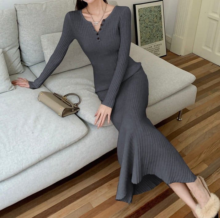 Henley neck elegant slim fit swing long knit dress ( 4color )