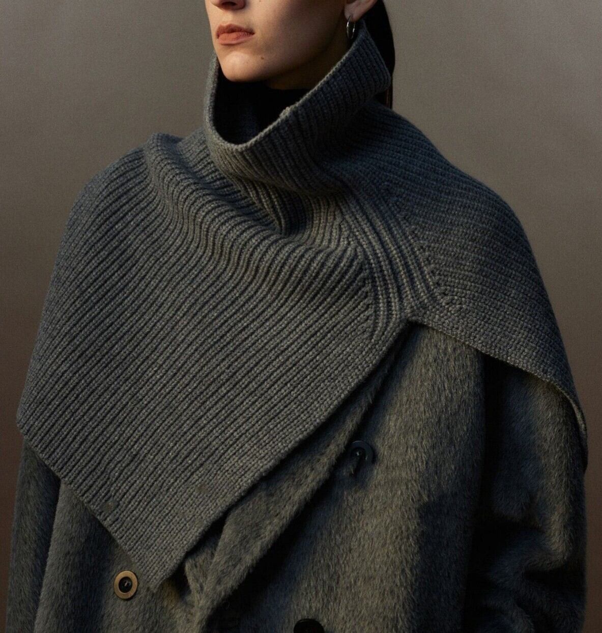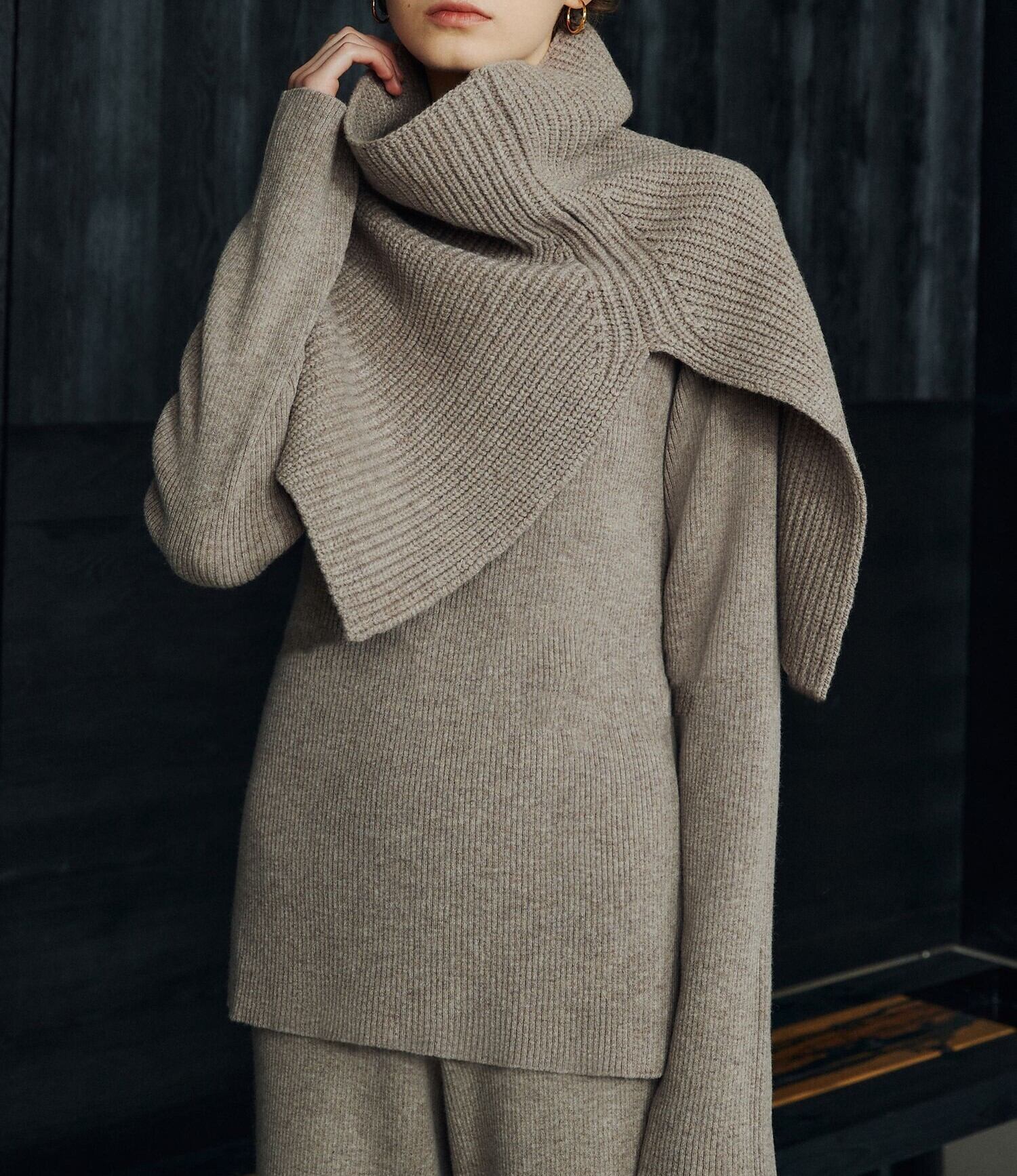 羽織るだけでフェミニンな雰囲気が漂うハイネックエレガントディープスリットニットマフラー。