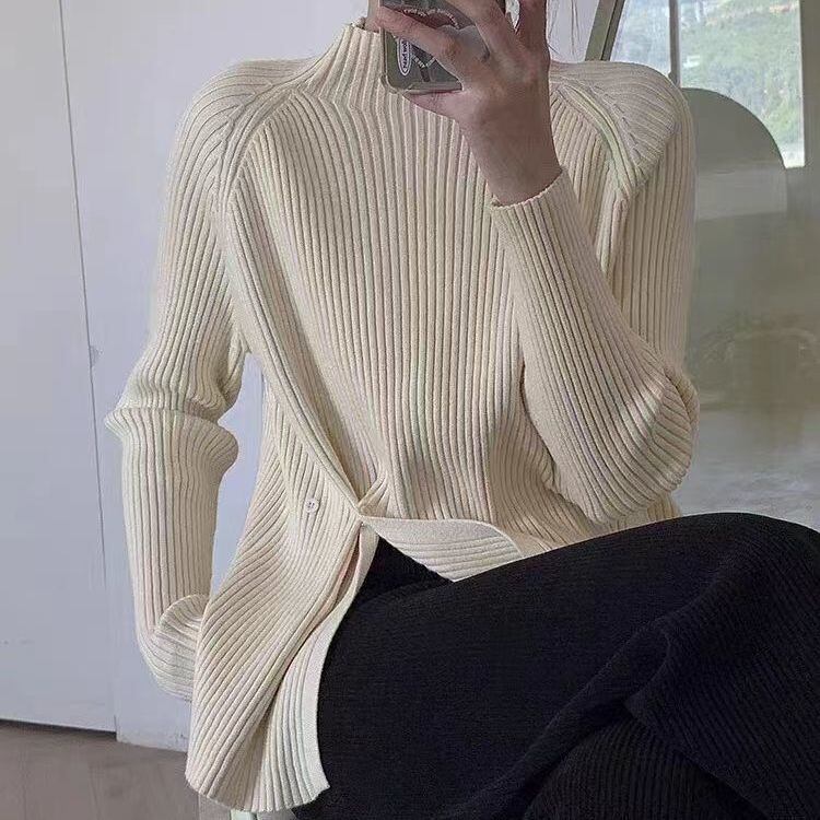 着用するだけでフェミニンな雰囲気が漂うハーフハイネックエレガントサイドスリットスリムニット。