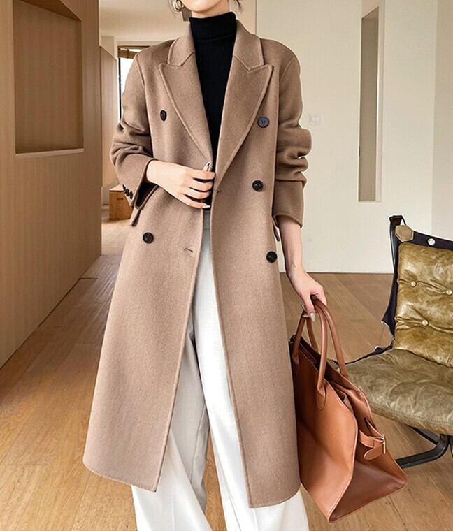 羽織るだけでエレガントでフェミニンな雰囲気が漂うスーツカラーエレガントダブルブレストスリムウールコート。