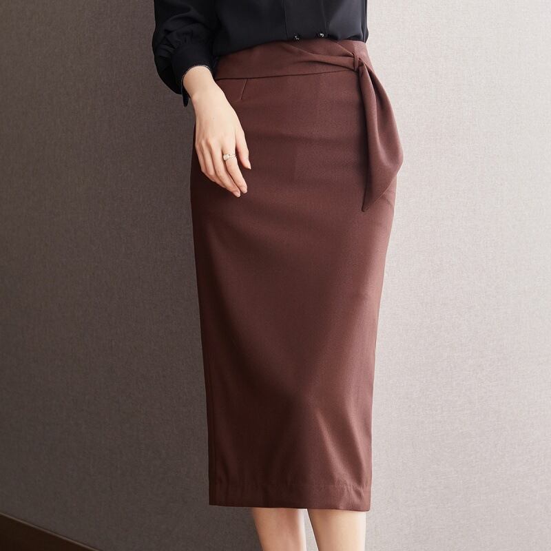 着用するだけでフェミニンな雰囲気が漂うハイウエストエレガントウエストリボンスリムミドルスカート。