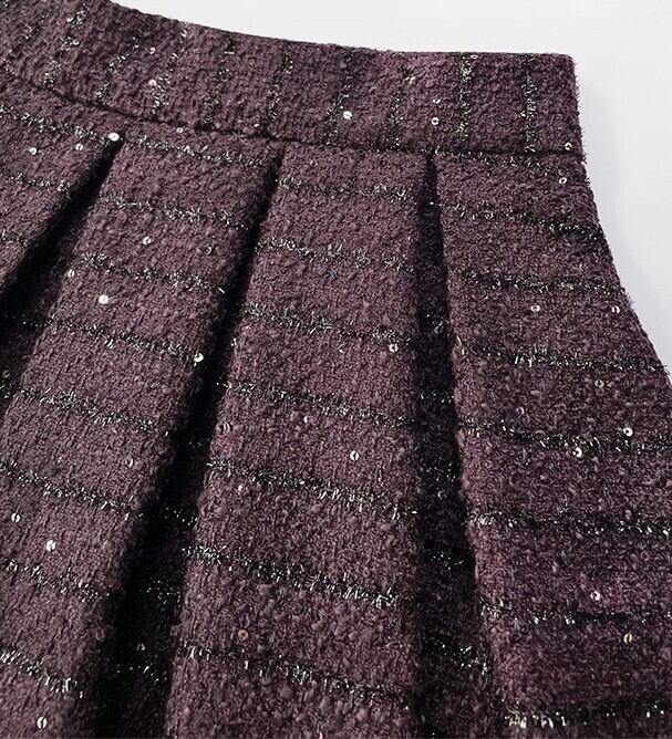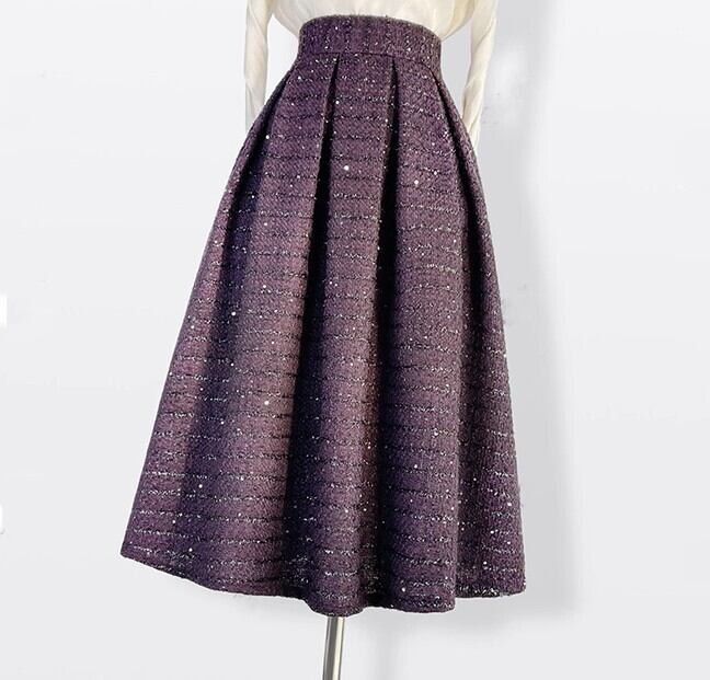 着用するだけでエレガントでフェミニンな雰囲気が漂うハイウエストエレガントスパンコールツイードスイングスカート。