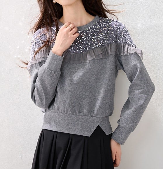 着用するだけで大人可愛い雰囲気が漂うチェストラッフルエレガントスパンコールヘムスリットシャツ。