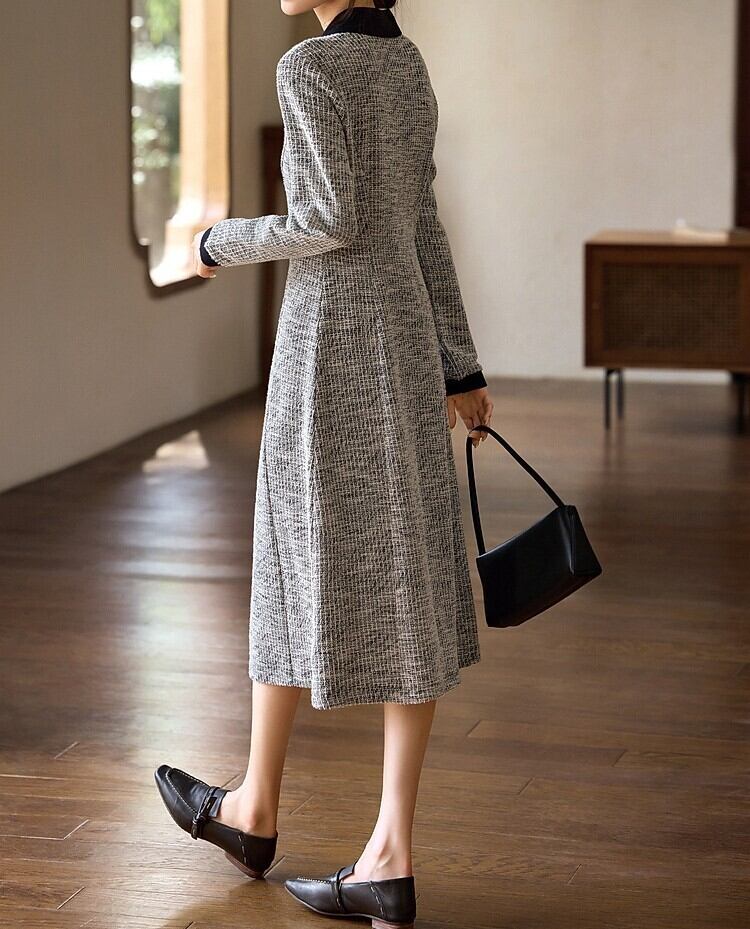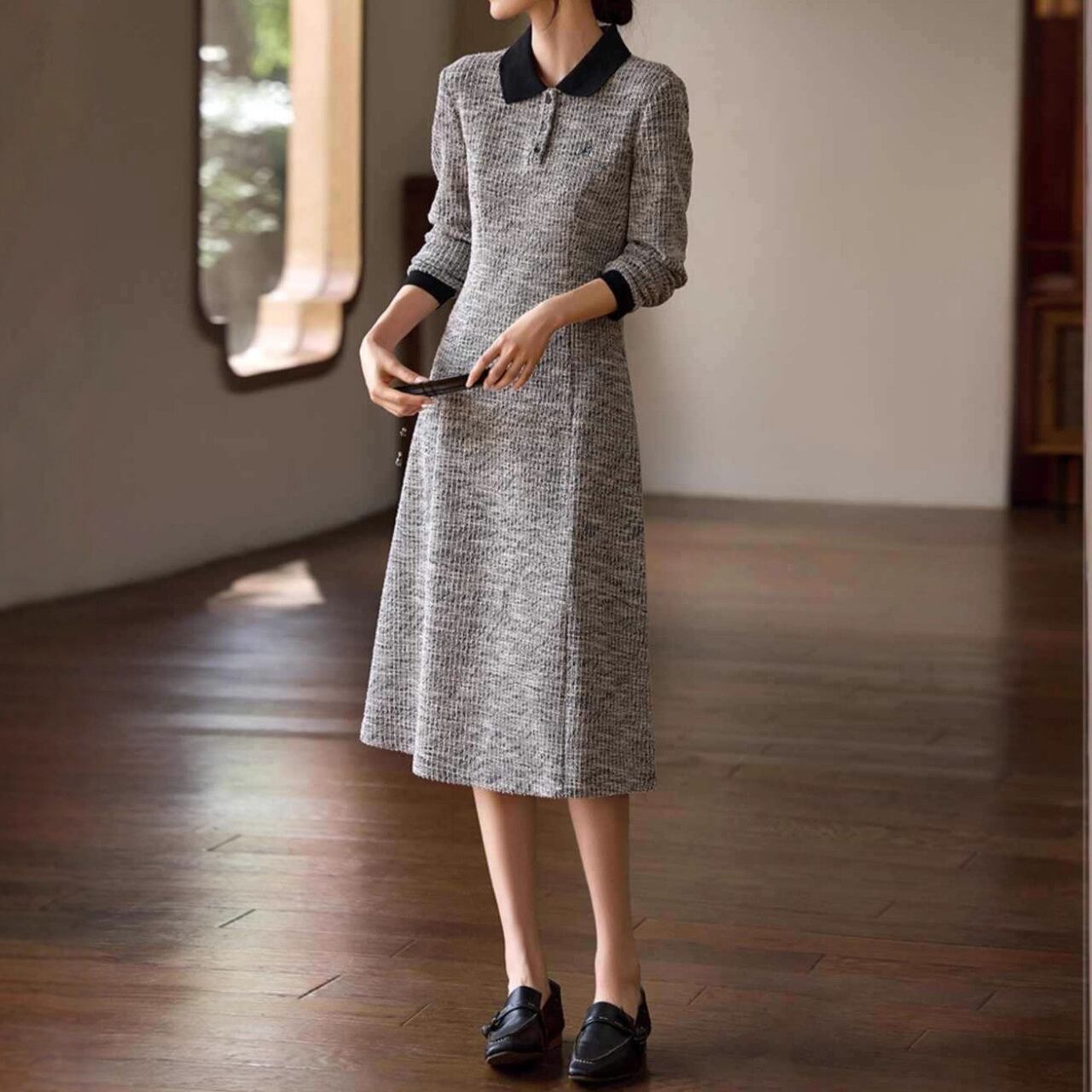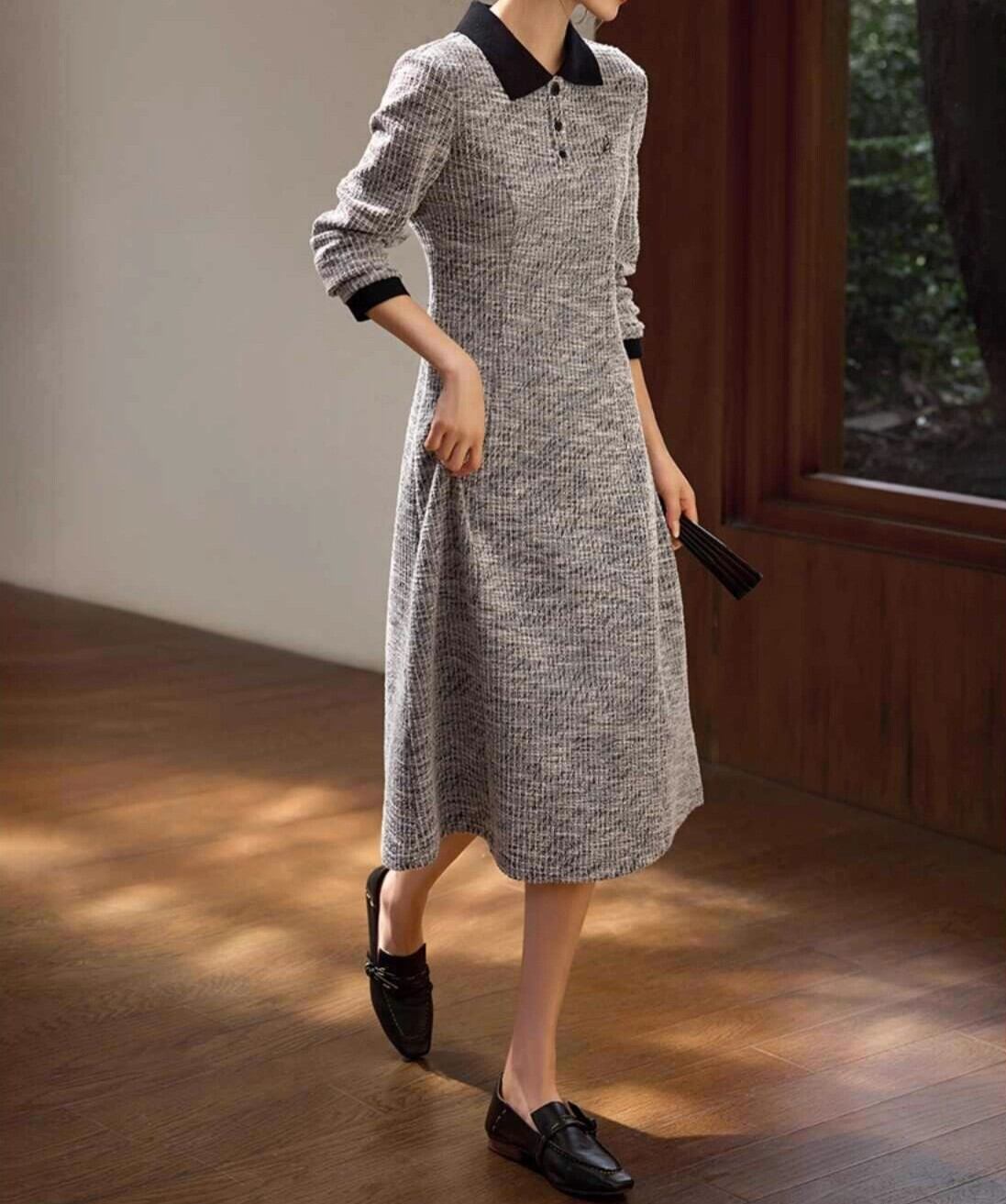 Polo collar elegant tweed design long slim dress